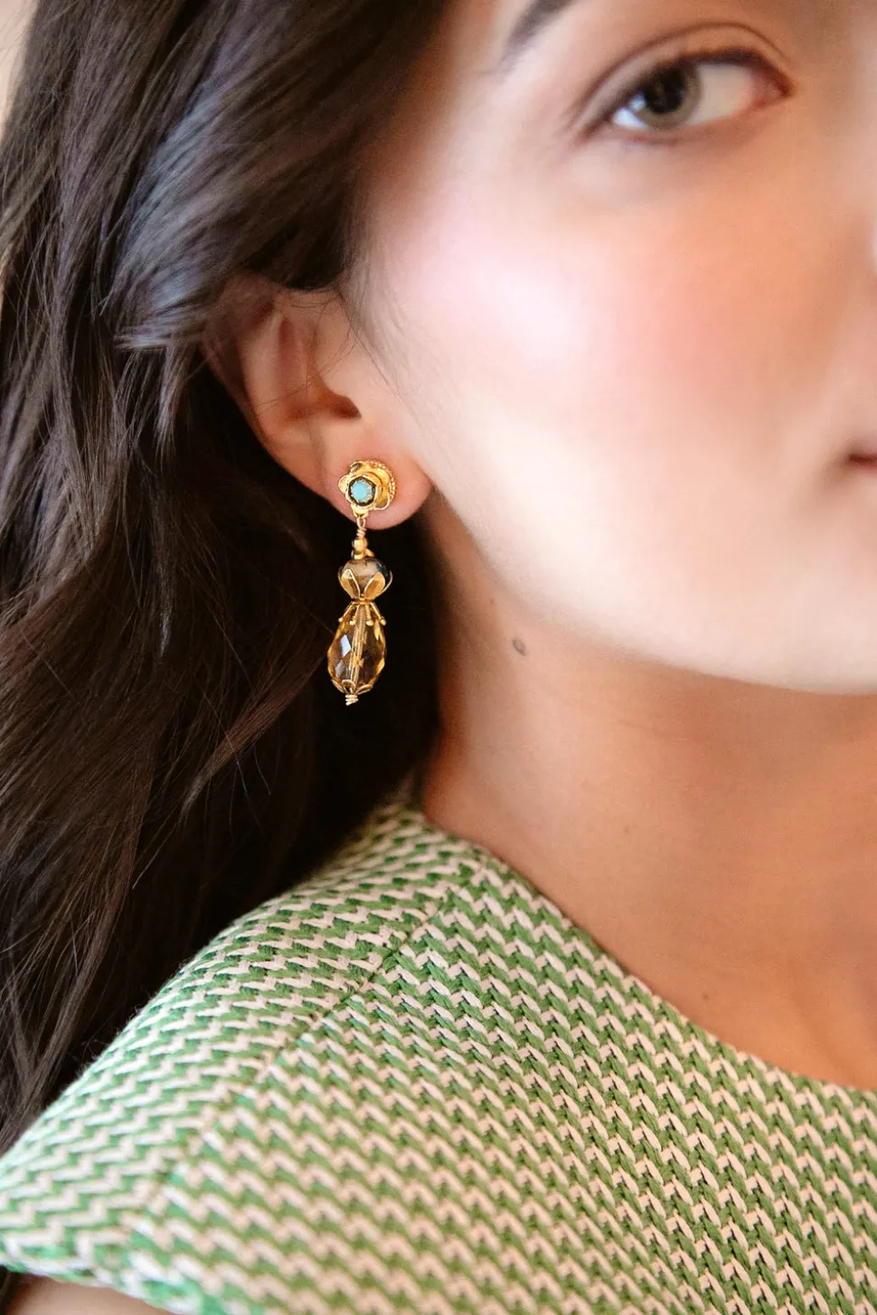 The mother-daughter duo behind Brinker + Eliza combine their experience in metalsmithing and fashion to create incredibly unique jewelry that feels custom-made. Employing pearls, shells, and earth’s most prized organic forms, these are pieces to be not just worn but treasured. The Granita Earrings are a summer dream. Featuring turquoise and lemon Czech glass stones with 24K antique gold-plated brass flowers hang from floral toppers. Adorned with a turquoise Swarovski crystal on stainless steel hypoallergenic posts.