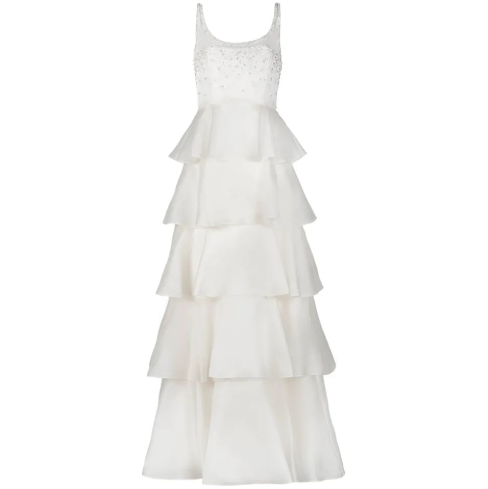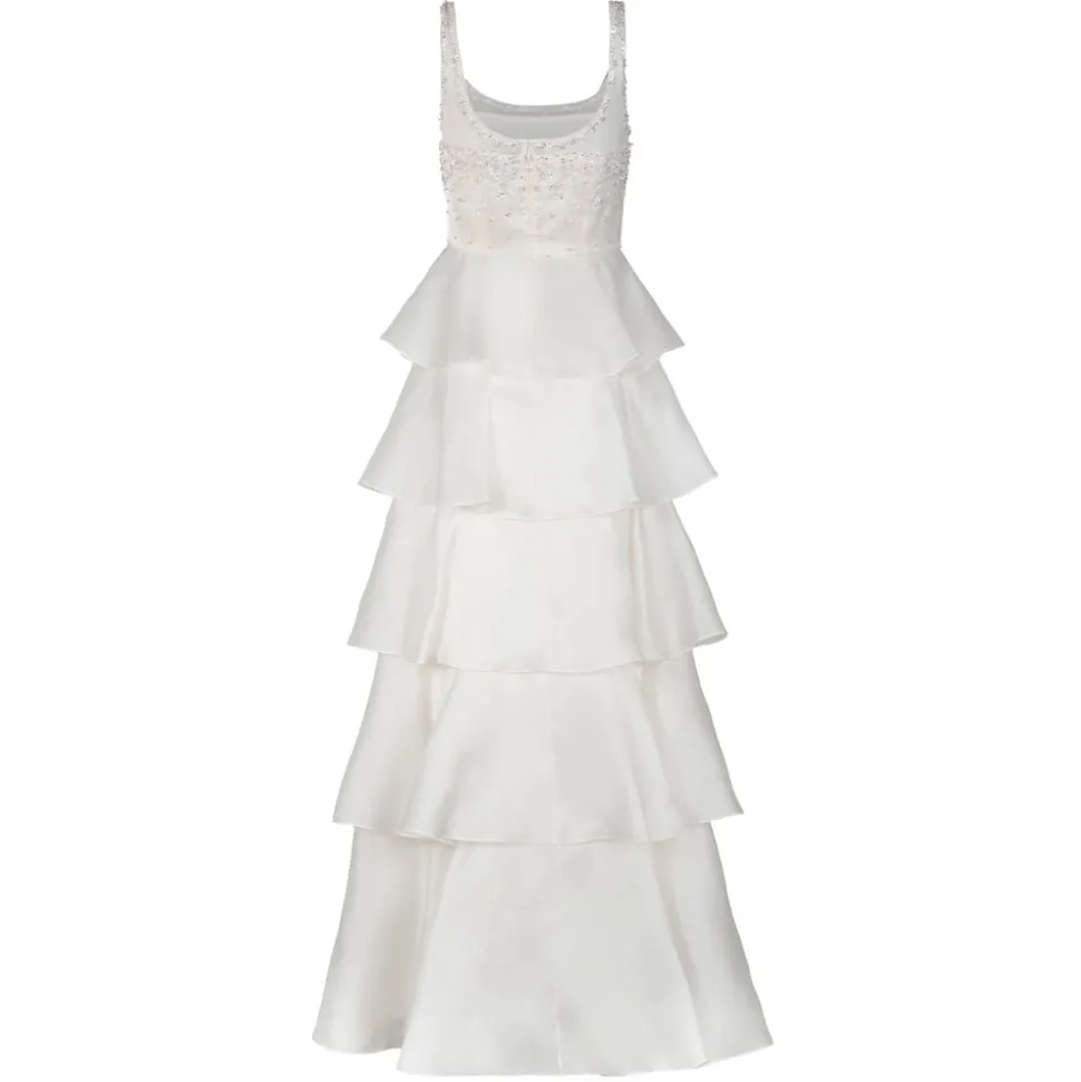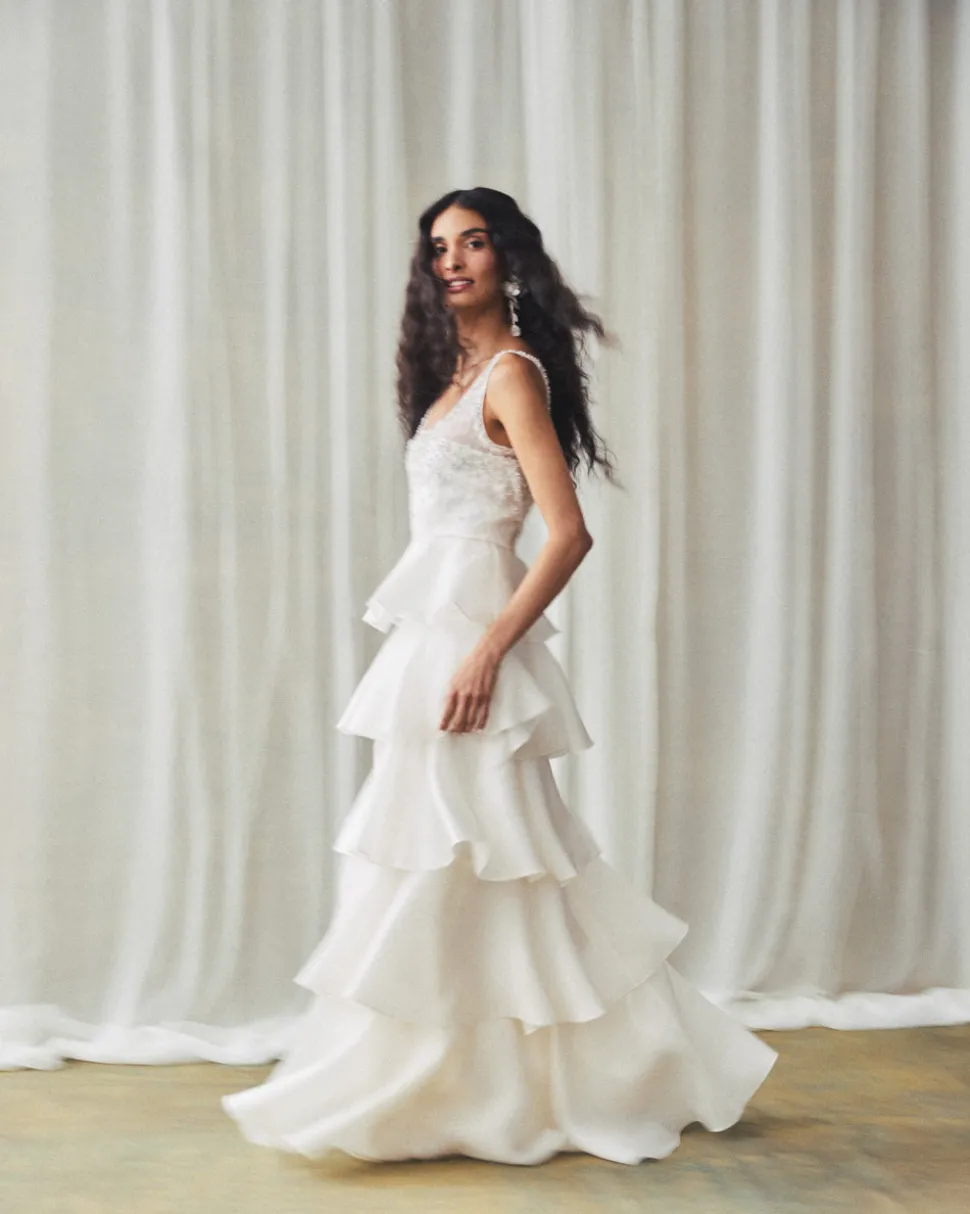 A graduate of the Savannah College of Design, award-winning Alexandra Pijut’s namesake line arrives from her studio in New York, offering luxe ready-to-wear pieces that distinguish themselves between femininity and practicality. The Grayal Gown in Ivory Satin Face Organza with Crystal Floral Embellishment features delicate, floaty layers that create a soft, ethereal silhouette, highlighting the brand’s signature craftsmanship. The sheer silk chiffon straps offer a whisper of skin, as the crystal floral embellishments at the bodice and neckline add a glimmering sense of drama. A subtle sheen from the satin face organza lends a radiant finish.