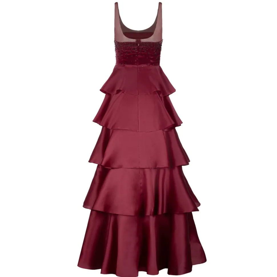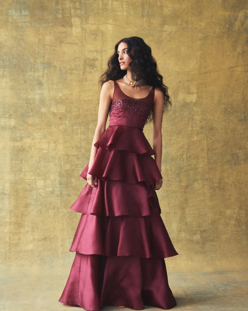 A graduate of the Savannah College of Design, award-winning Alexandra Pijut’s namesake line arrives from her studio in New York, offering luxe ready-to-wear pieces that distinguish themselves between femininity and practicality. The Grayal Gown in Plum Satin Face Organza is a romantic, ethereal statement featuring airy layers of silk and intricate crystal floral embellishments. Finished with sheer chiffon straps and an invisible zipper, it blends softness and structure in an unforgettable silhouette.