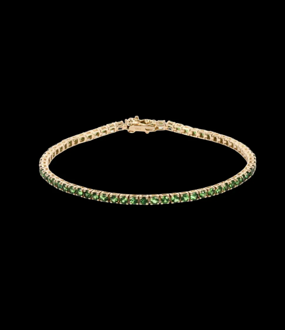 14 karat yellow gold. 3 carat green tsavorite. Tongue clasp with safety catches. Bespoke sizes available. Email for details.