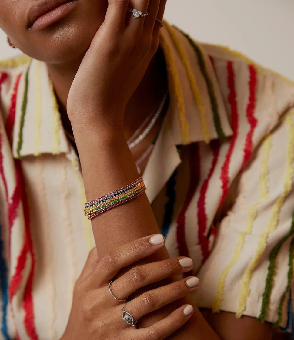 Timeless cool and ethical sourcing are at the heart of London-based Roxanne First’s fine jewelry studio. Solid gold, beautiful beads, and hand-picked diamonds come alive in her vibrant, fun-loving collections that find the meeting place of whimsy and contemporary luxury. Transfixing green tsavorite line a traditional silhouette in the Green Tsavorite Tennis Bracelet—as elegant as it is captivating.