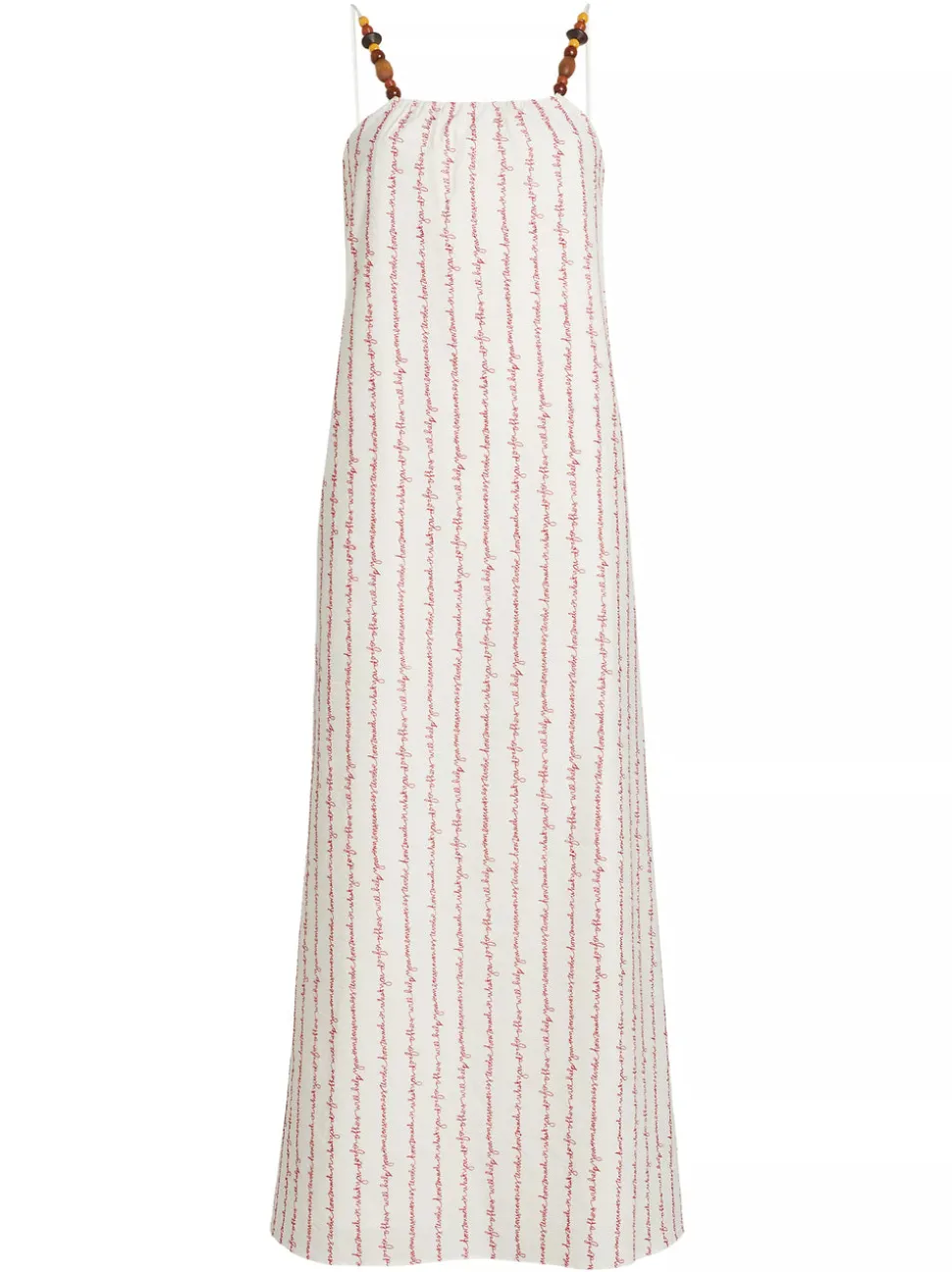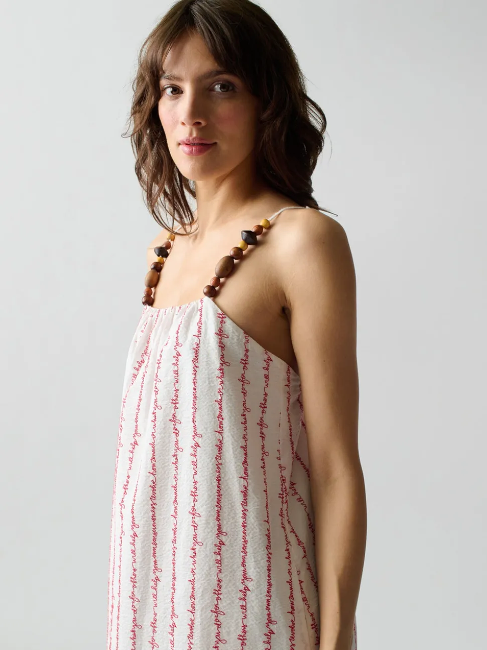 Lingua Franca is a line of sustainably-sourced, fair trade luxury ready-to-wear and cashmere pieces, all hand-stitched by women in New York City. Every word on Lingua Franca’s staple pullover sweaters is chalked in script by designer Rachelle Hruska MacPherson before it is ever stitched. The brand collaborated with the estate of the late Patmos poet Robert Lax for this collection, and the Grikos Stripe Dress in White showcases one of his poems, handwritten by Rachelle and machine-embroidered as stripes. The poem reads: “How much or what you do for others will help your consciousness evolve.” Made from 100% cotton seersucker, this maxi features herringbone tape straps with wooden bead details, side seam pockets, and is fully lined in 100% cotton.
