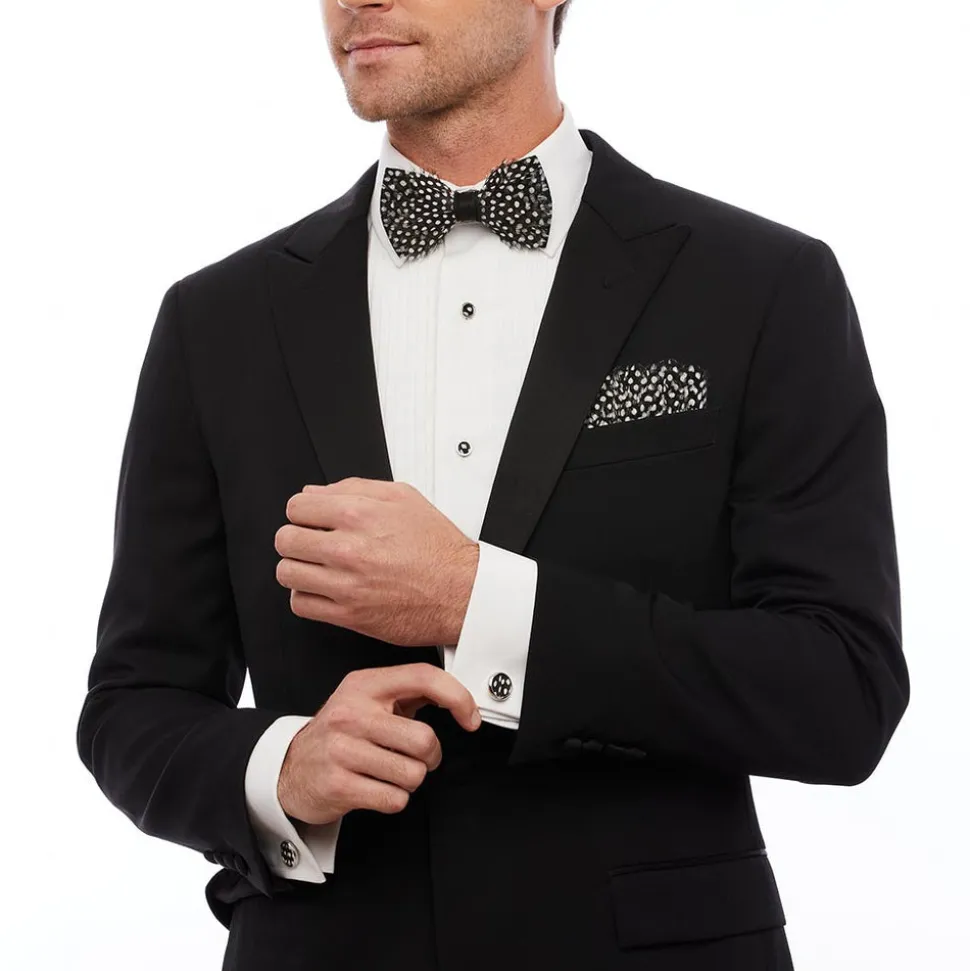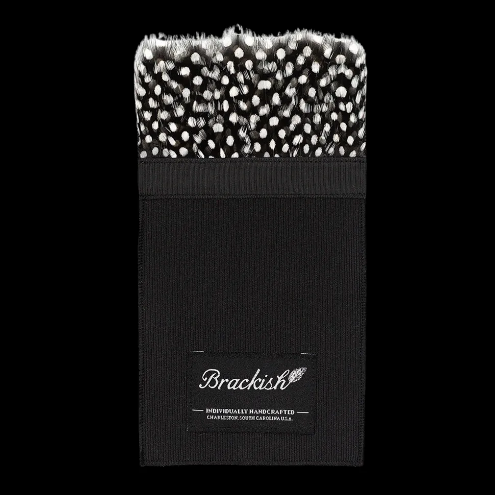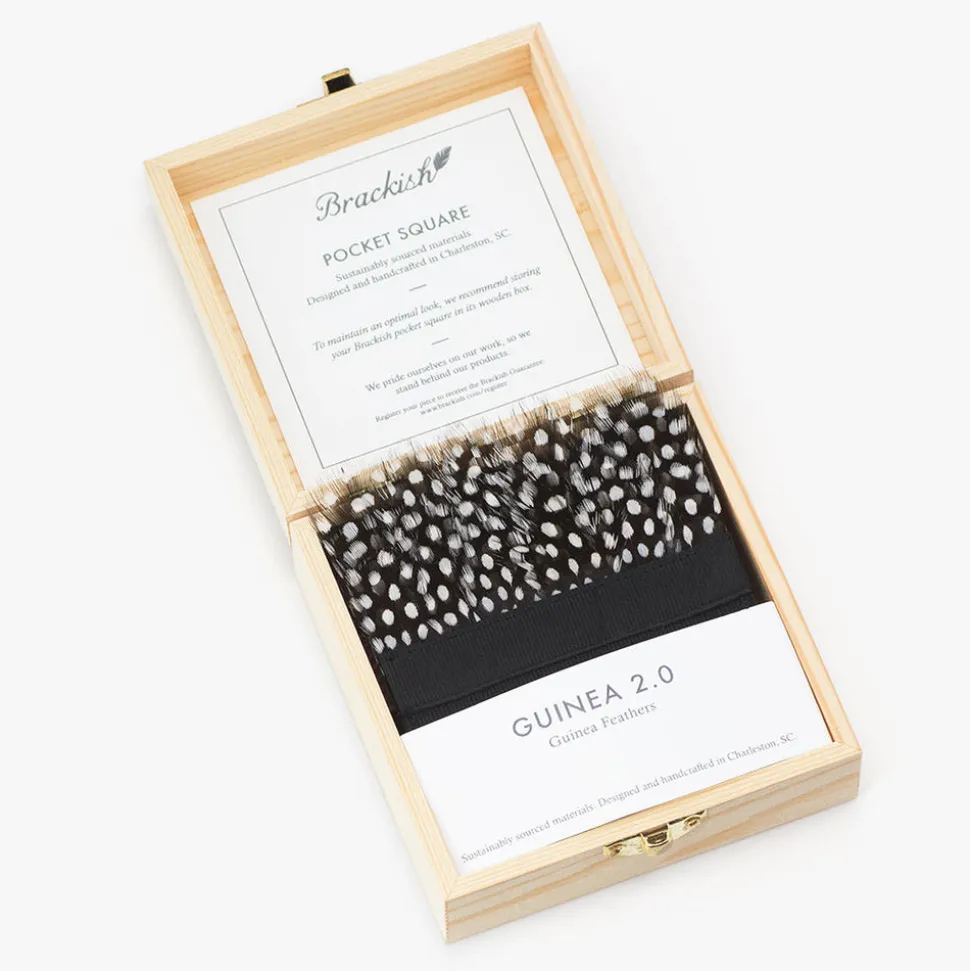 Brackish began with one feather bow tie designed by Ben Ross and gifted to his groomsman, Jeff Plotner. Since its inception, the brand has blossomed into a full line of men’s and women’s accessories designed and handcrafted in Charleston, South Carolina with each piece focused on honoring the beauty found in nature. The Guinea 2.0 Pocket Square is a completely bespoke piece made to fit any pocket size. Wear it parallel to your pocket, or with one corner creating a “peak” popping out. Control how much of the feather panel shows by pushing it deeper into the pocket. Ideally complements the Edisto bow tie. Made with guinea feathers.
