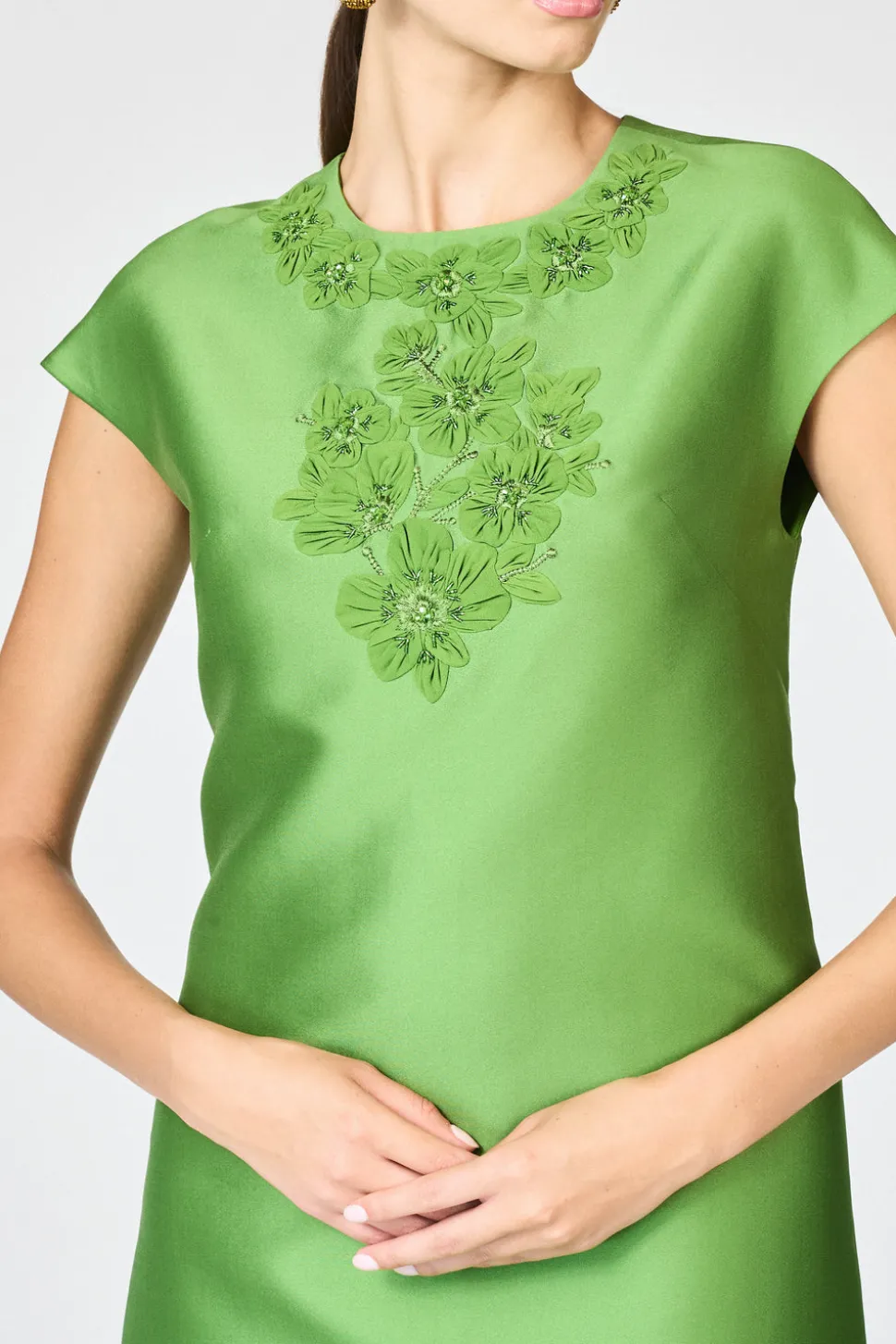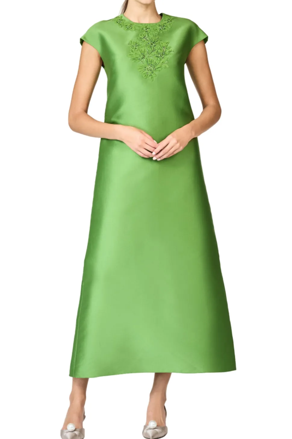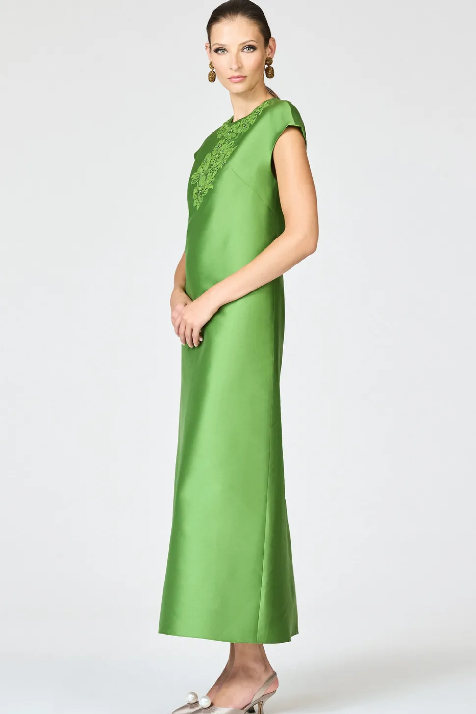 Born in India, Sachin and Babi bonded at New York’s Fashion Institute of Technology and launched an embroidery business, working with top houses, like Oscar de la Renta and Manolo Blahnik. Today, the brand works with their own factory in Mumbai, controlling quality at every stage, and producing womenswear that is at once unique, beautiful, and wearable. The Gwendolyn Gown in Green Garnet is tailored in luminous poly silk gazar with cap sleeves and a clean column silhouette. The neckline is adorned with tonal floral embroidery and faceted crystal embellishments for a dimensional, light-catching finish.