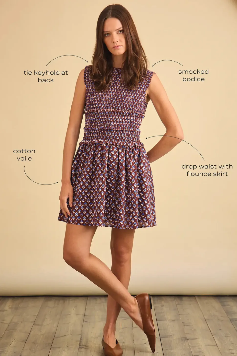 100% cotton voile. Round neckline. Sleeveless. Elongated smocked bodice. Drop waist with flounce skirt. Mini length.