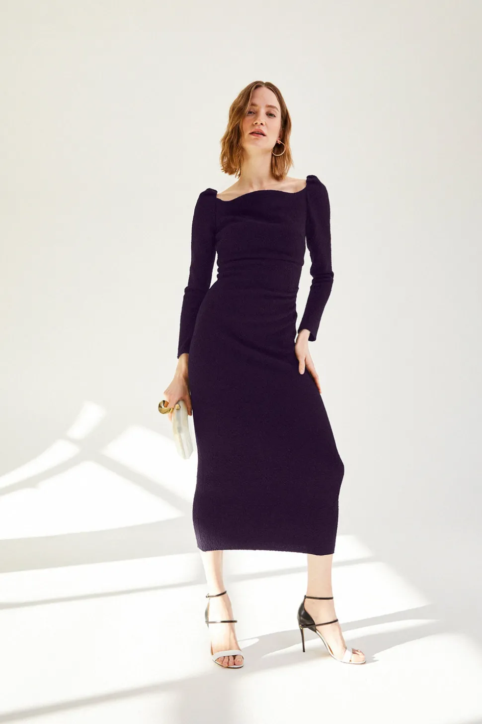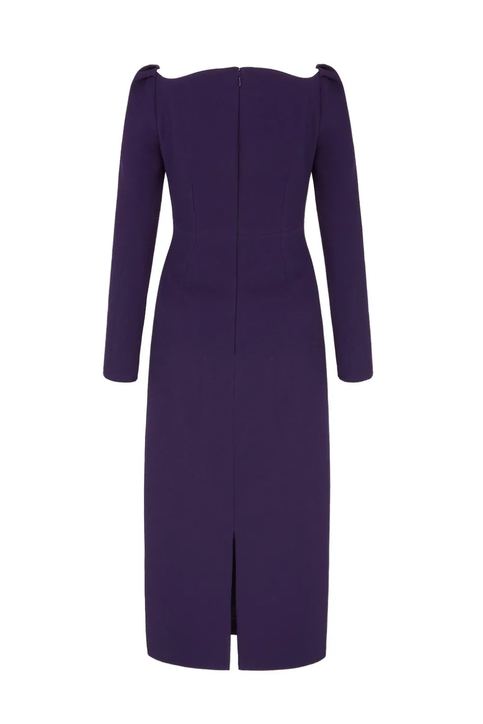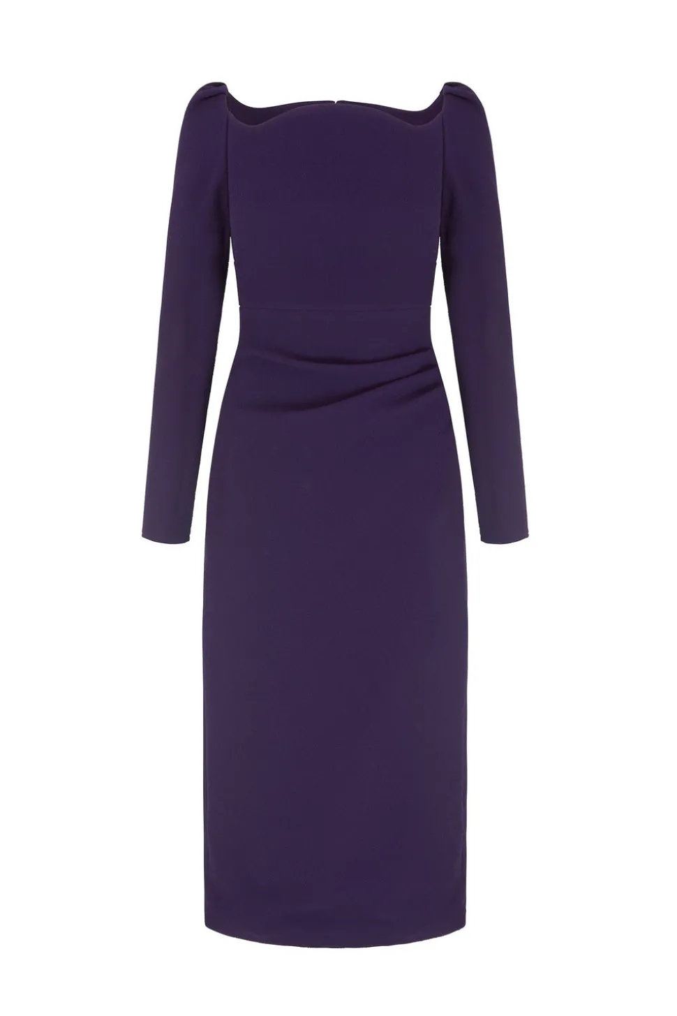 Since 2006, British designer Suzannah Crabb has been creating high-luxury womenswear pieces. Her creations are sustainably made, flawlessly crafted, ultra-flattering, and an excellent choice for all your special occasions. Among them is the Halley Dress—a perfect day-to-dinner midi, meticulously made from Italian stretch matelassé crepe, sourced from a fourth-generation sustainable textile manufacturer. This fabric, in a rich shade of Blackcurrant, not only defines the body beautifully but also, thanks to the stretch silk satin lining, makes it a dream to wear. Waist-enhancing asymmetrical pleats drape across the bodice, while the sculpted wide neckline elegantly frames the décolletage. The slim, bracelet-length sleeves, finished with a subtle pleated sleeve head, add to the overall elongating and elevated aesthetic.