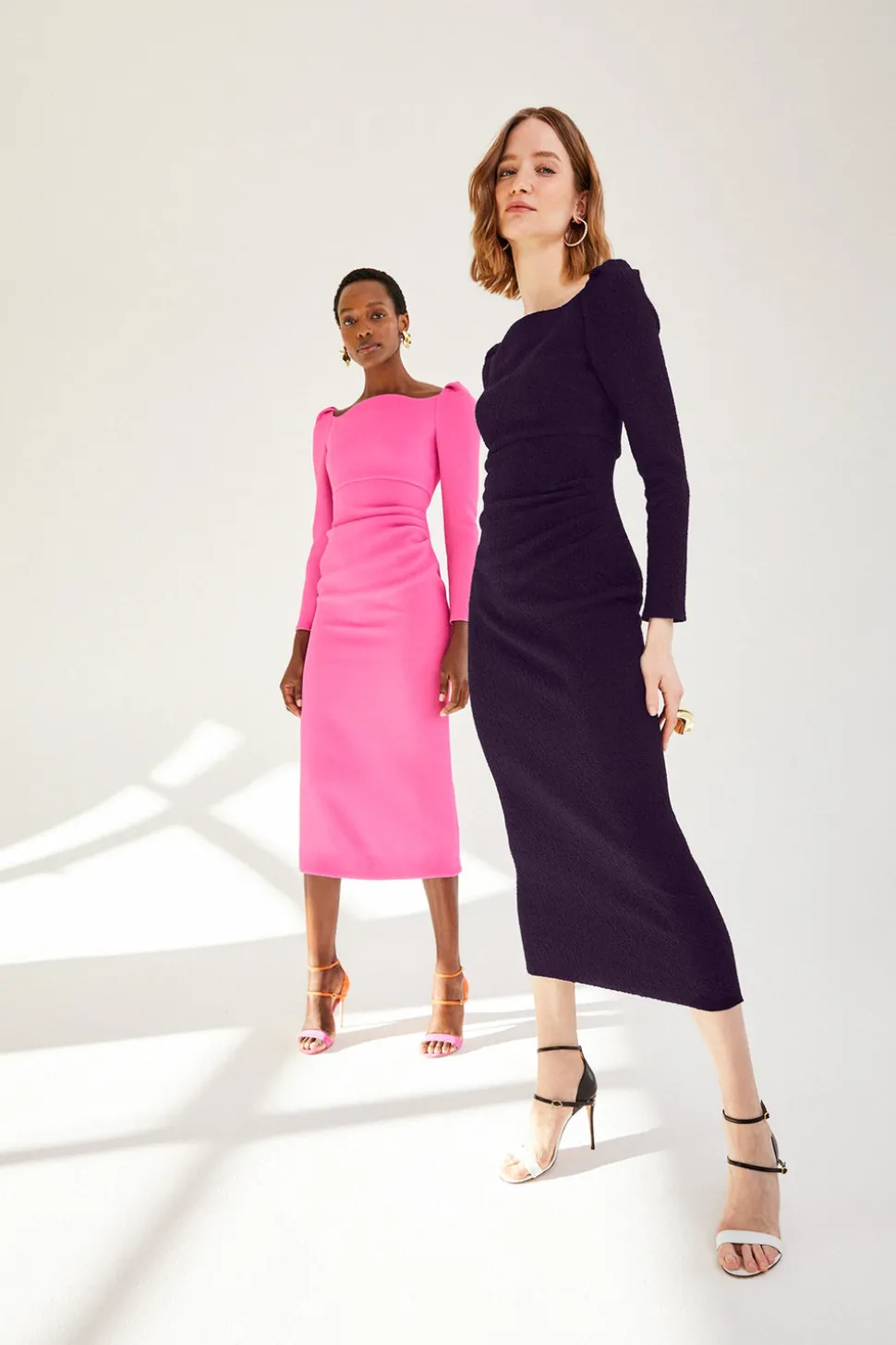Since 2006, British designer Suzannah Crabb has been creating high-luxury womenswear pieces. Her creations are sustainably made, flawlessly crafted, ultra-flattering, and an excellent choice for all your special occasions. Among them is the Halley Dress—a perfect day-to-dinner midi, meticulously made from Italian stretch matelassé crepe, sourced from a fourth-generation sustainable textile manufacturer. This fabric, in an eye-catching Hot Pink, not only defines the body beautifully but also, thanks to the stretch silk satin lining, makes it a dream to wear. Waist-enhancing asymmetrical pleats drape across the bodice, while the sculpted wide neckline elegantly frames the décolletage. The slim, bracelet-length sleeves, finished with a subtle pleated sleeve head, add to the overall elongating and elevated aesthetic.