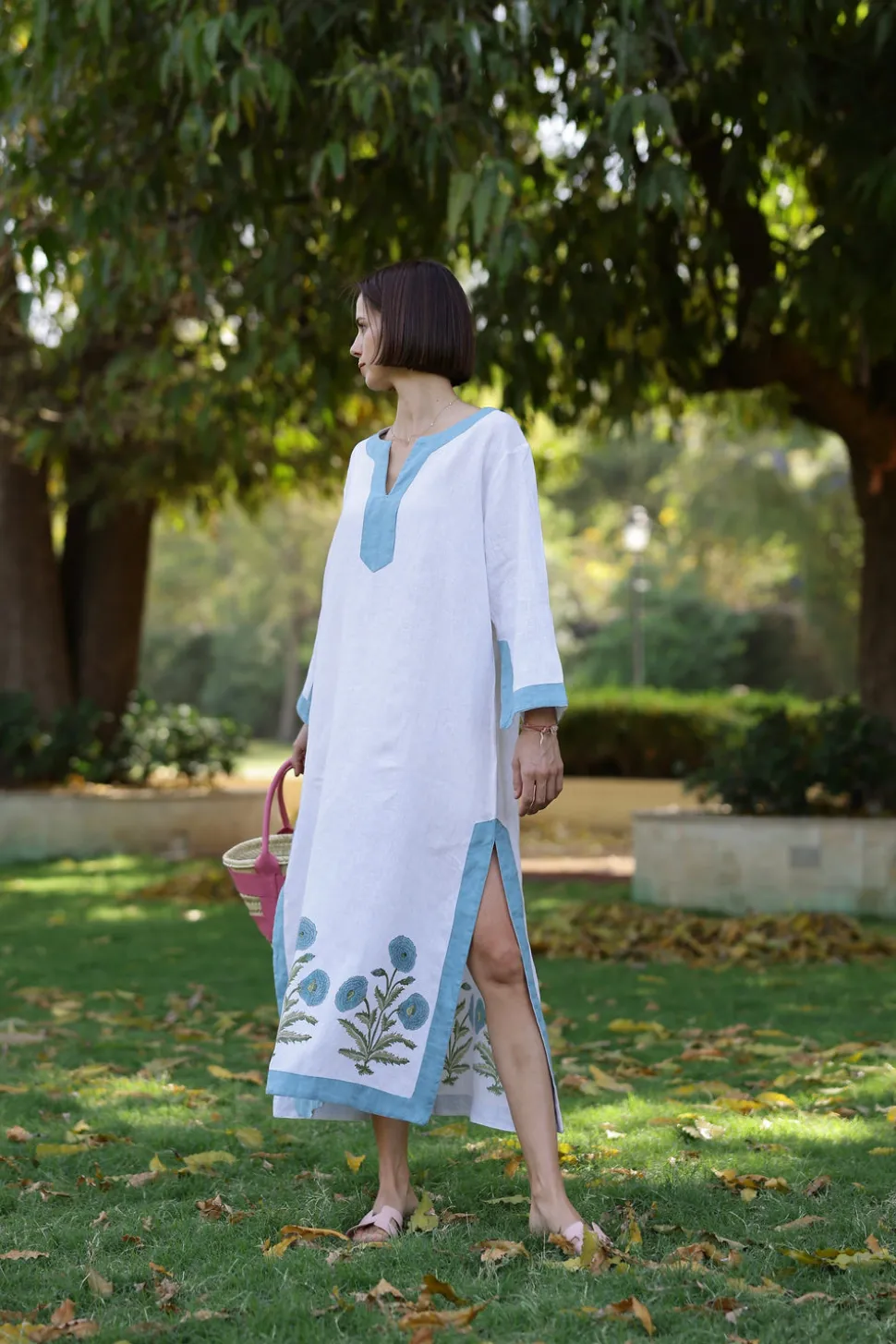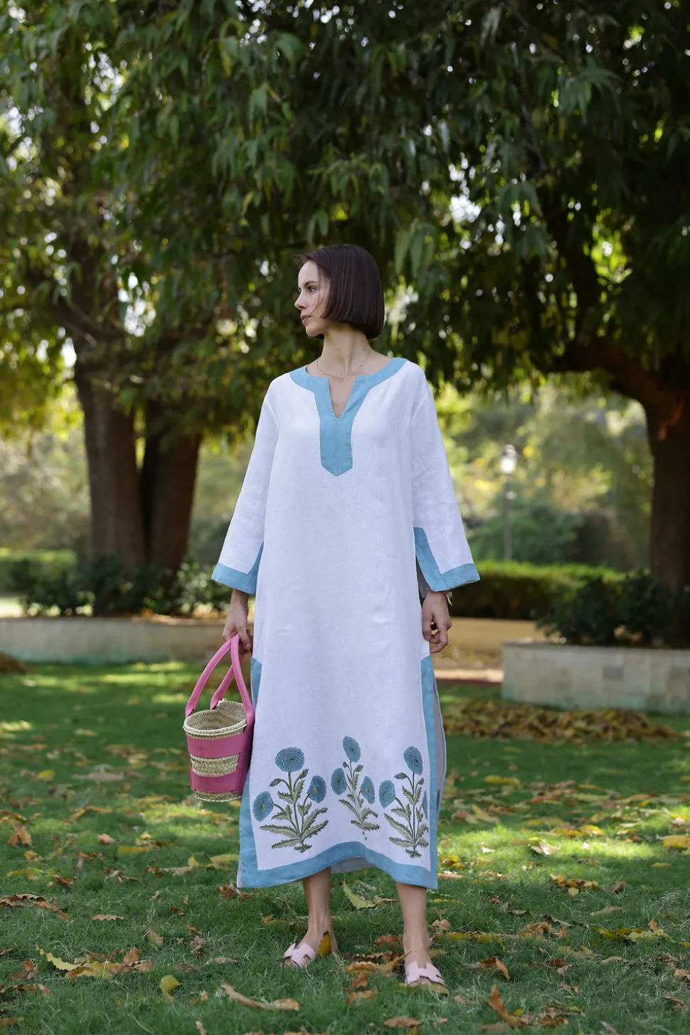 Introducing Maison Marigold, a new luxurious small-batch women’s resortwear brand inspired the wanderlust of travel. Our collections effortlessly transition from beachside lounging to an elegant evening on the town. The simplicity of design and classic silhouettes are the foundations for each and every style. Hand-printed linen and cotton make for comfortable and effortless pieces that are both feminine and flattering. The Hampton Caftan in Blue Flower is a classic silhouette that is complemented with eye-catching floral motifs, colorful palms, or classic paisleys with contrasting borders. Wear this no-fuss maxi all day, whether it is over a bathing suit by the pool or a night on the town.