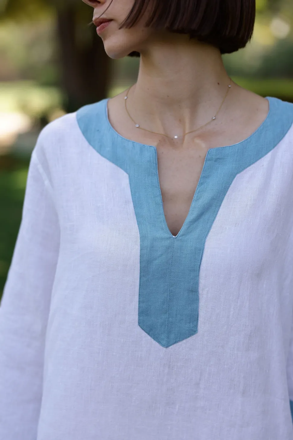 Hand printed front and back on 100% European linen. Versatile travel style. Flattering split neckline. Slits at arms and legs.
