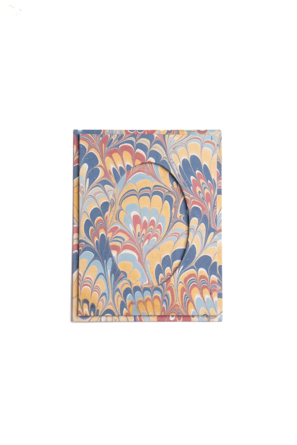 Handcrafted by artisans in India using traditional marbling techniques. Made from 100% recycled cotton handmade paper. Features a circular opening for a 4″ x 6″ photograph.
