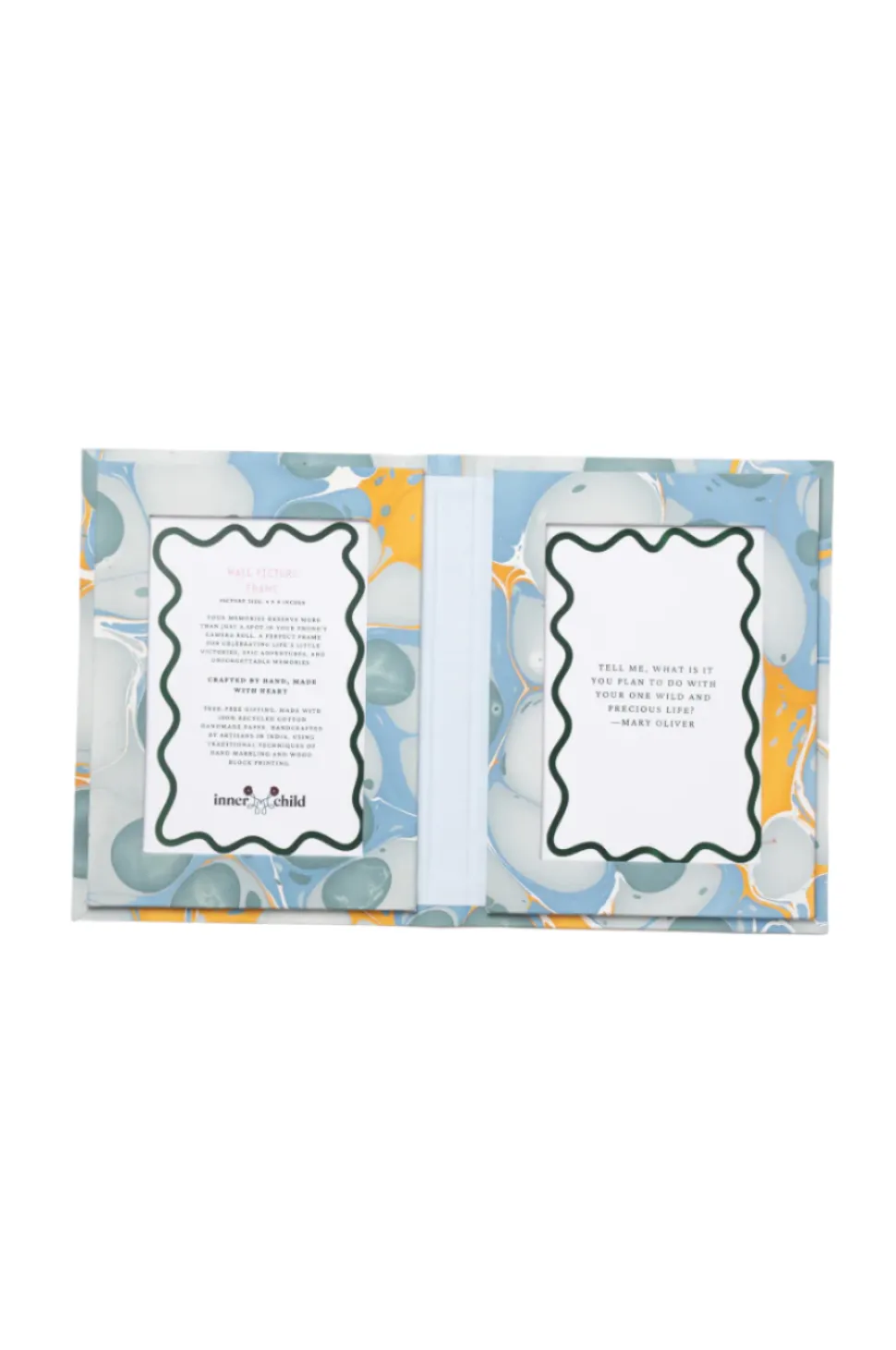 Born through whimsy and joyful design, Inner Child works directly with multi-generational artisans and small family-owned workshops. The brand’s mission is to sustain traditional craftsmanship through small-batch production—emphasizing makers and tastemakers. Your memories deserve more than just a spot in your phone’s camera roll. The Hand Marbled Picture Frame Folding Book in Grey and Blue is a beautiful frame for celebrating life’s little victories, epic adventures, and unforgettable memories.