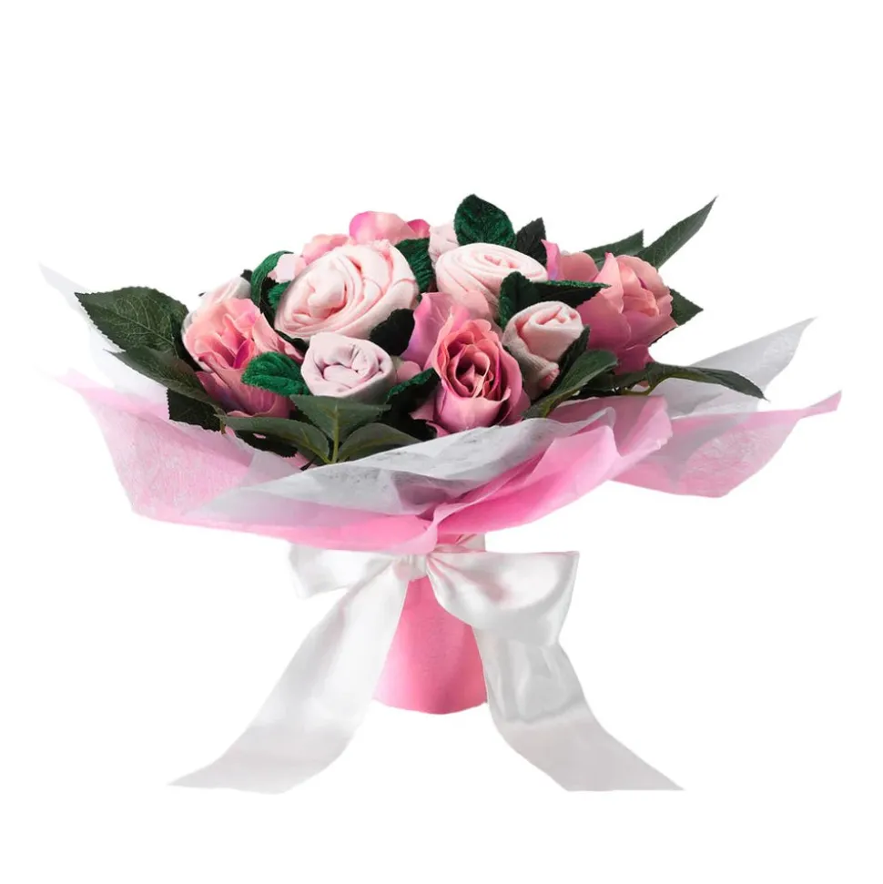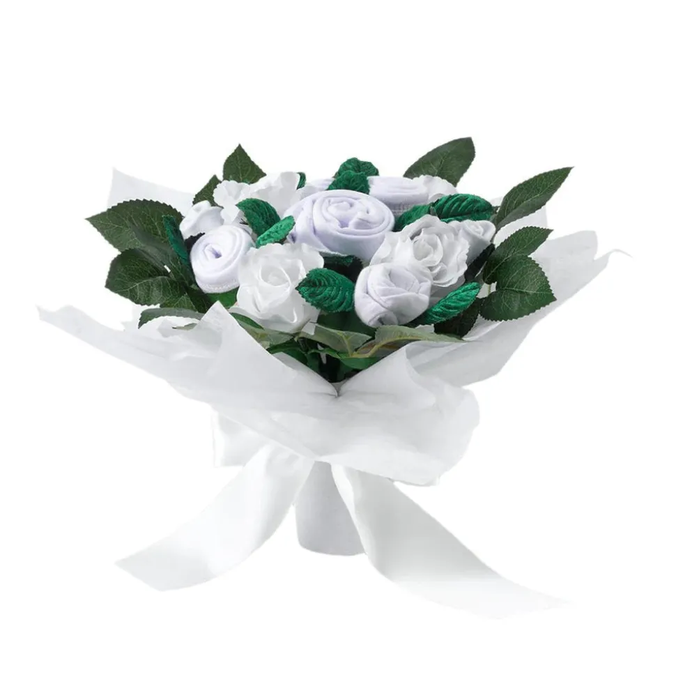 As a sweet alternative to fresh flowers, Babylooms designs baby clothes bouquets for a thoughtful, loving gift. The brand, founded in 2005, blossomed and flourished their collection by offering personalized accessories for new moms, babies, and toddlers. The Hand Tied Baby Clothes Bouquet features white baby clothes with wonderfully soft fabric against the delicate skin of a newborn baby. The bouquet contains silk roses which can be kept by the new parents as a lasting keepsake.