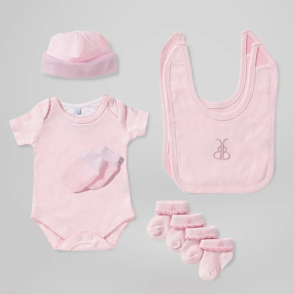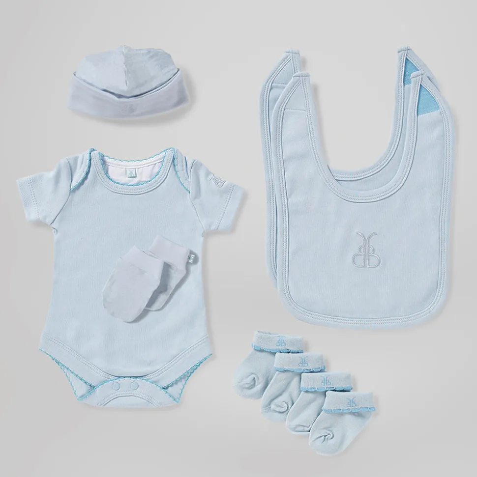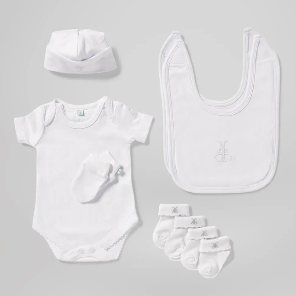 Includes: 100% cotton 1 x white hat, 4 pairs of white socks, white bodysuit, 2 white bibs, and 1 scratch mitten.