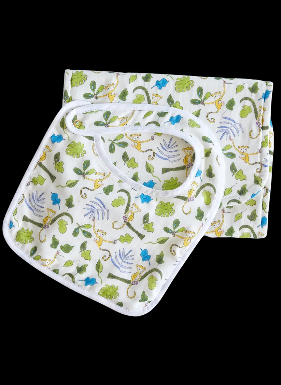 Includes 1 cloth and 1 bib. Made with 100% GOTS certified organic cotton. Adjustable with two snap settings. Made in Portugal.
