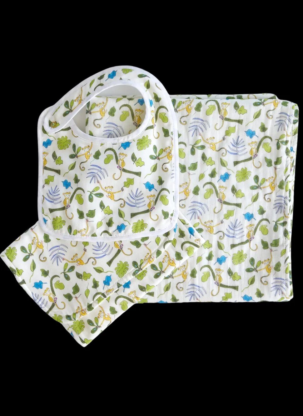 Includes 1 bib, one shawl blanket, 1 burp cloth. Made with 100% GOTS certified organic cotton.