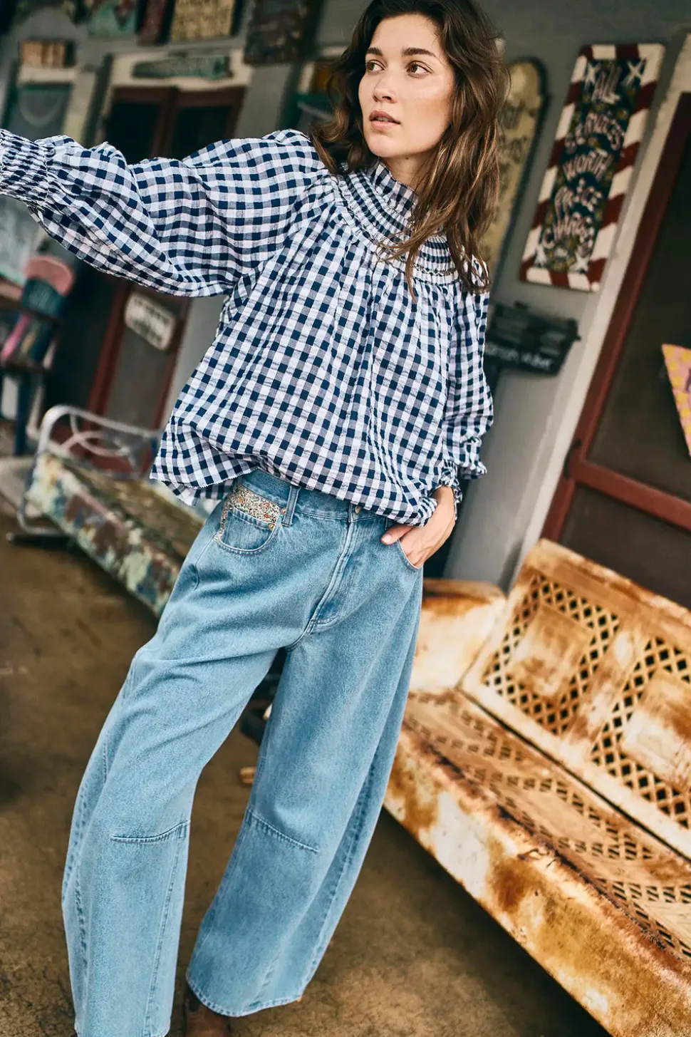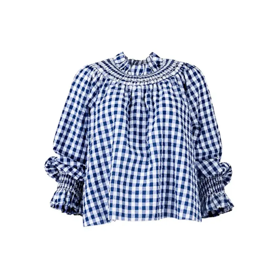 Hunter Bell strives to spark joy and inspiration with clothing that empowers women to embrace their personal style. The New York City-based brand is all about fashion-forward, fun looks, designed with detailed craftsmanship and exceptional wearability. The Hayes Top in Navy & White blends playful pattern with timeless tailoring. Made from lightweight cotton in a classic gingham check, it features puff sleeves that flare at the wrist, a smocked yoke with delicate embroidery, and a polished crew neckline. The result: a breezy yet refined piece that pairs effortlessly with anything from the matching Jemma Shorts to vintage denim.
