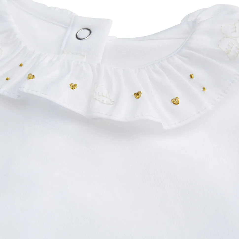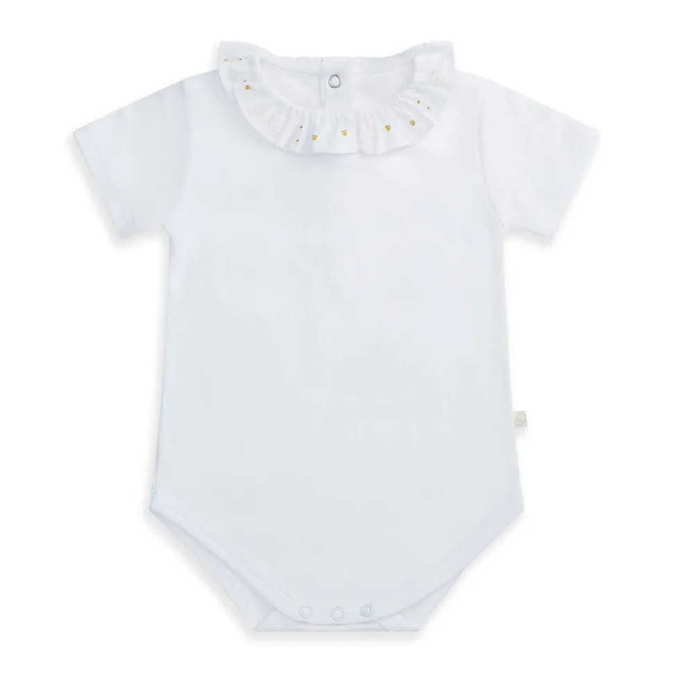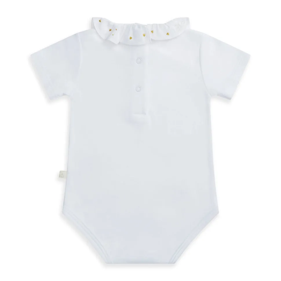 Princess Marie-Chantal of Greece’s eponymous label is known internationally for its unmatched style and the quality of materials—like their organic, hand-picked Pima cotton—which lies at the heart of their baby essentials and contemporary children’s clothing. The short sleeves and snap popper fastening add to the ease of dressing your little one, while the adorable Heart and Angel Wing ruffle collar adds a touch of elegance and luxury to their outfit.