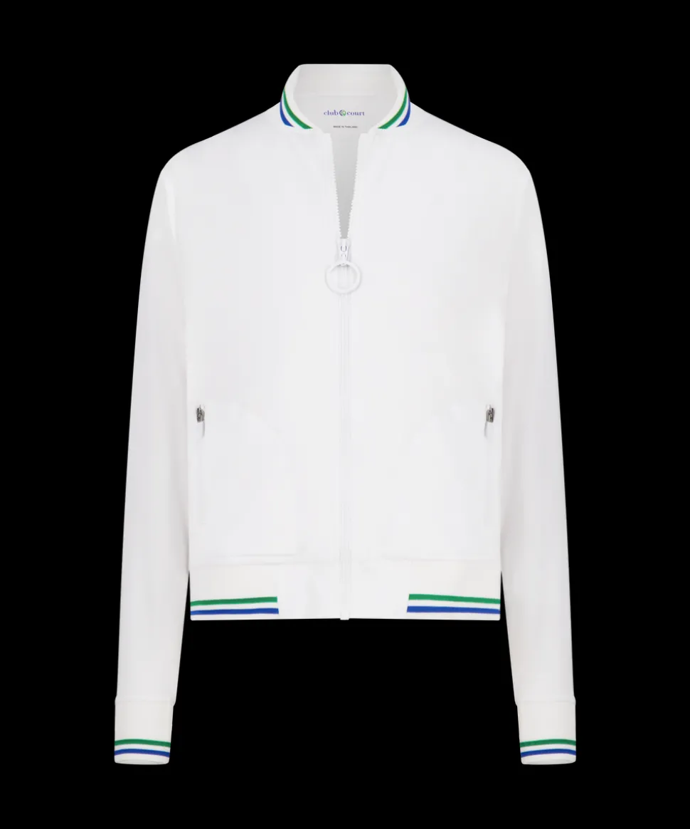 Taking inspiration from vintage tennis fashion, Club & Court employs modern fabrics and silhouettes, as well as a soft palette and bold prints to produce sporting attire, skirts and dresses that accommodate and elevate an active lifestyle. The Heidi Course Jacket is a returning bestseller, crafted from silky-smooth performance polyester with UPF 30 protection. Trimmed in cadet blue and kelly green at the collar, sleeves, and waist, it boasts a relaxed boxy fit and two side-zip pockets for functionality and polish.