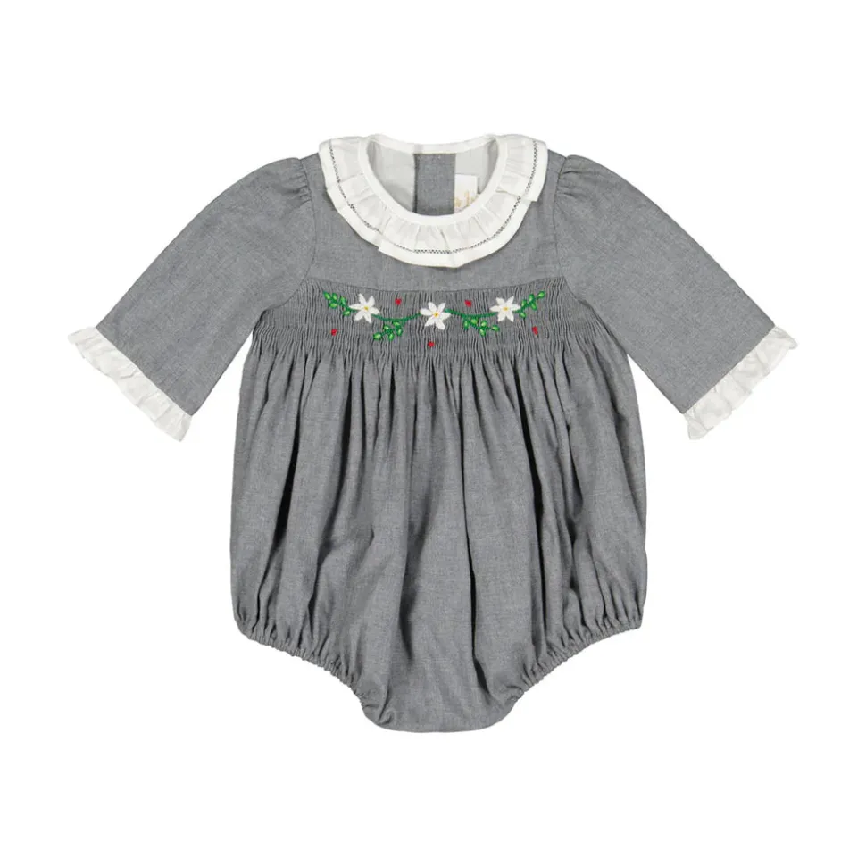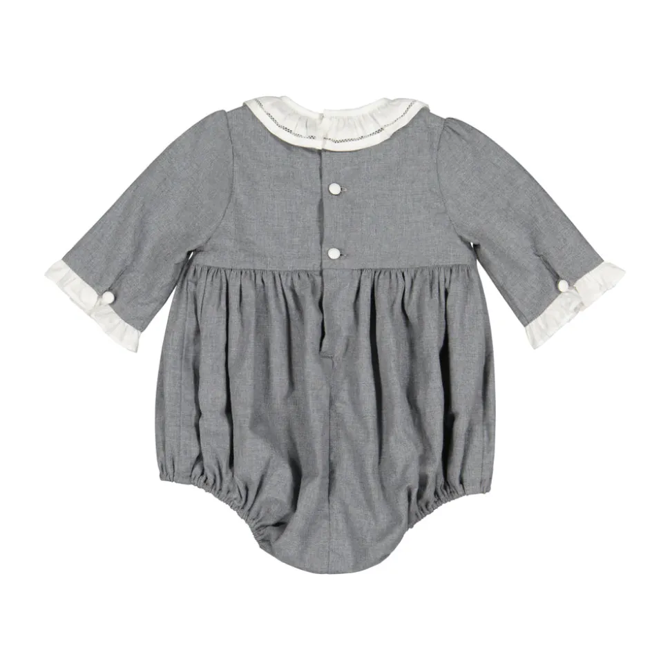 Antoinette Paris creates elegant, handmade garments for little girls, designed in Paris with sophisticated, refined, and exclusive “Haute Couture” details. Their collections include dresses, dungarees, and bubbles, available from birth to 10 years old, made for any occasion and tailored for a new generation of children. The Heidi Grey Long Sleeve Smocked Bubble is a quintessentially French piece, designed to bring elegance to winter days. The hand-smocked chest is embroidered with delicate Edelweiss flowers, while white frill finishes at the neckline and sleeves add a touch of charm. The soft cotton twill fabrication ensures both comfort and durability for your little one.