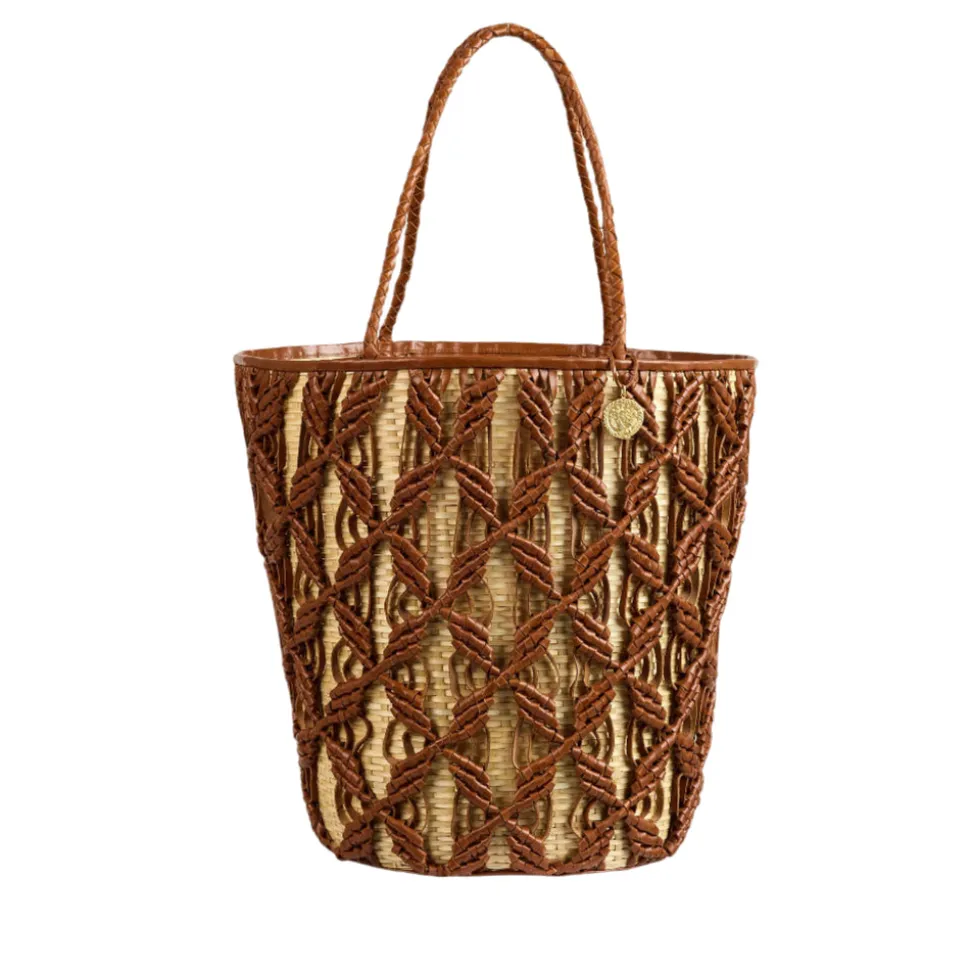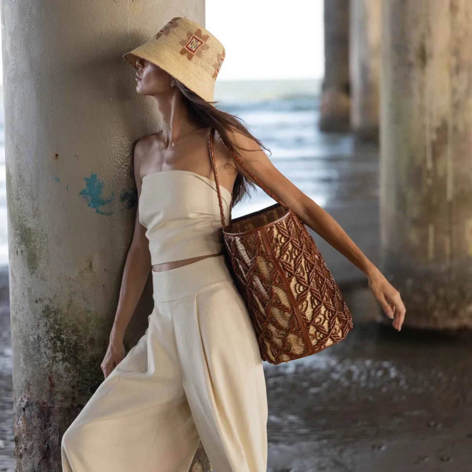 Founded, owned, and operated by women, Freya redefines the Panama hat with modernized silhouettes, UPF 50+ coverage, and organic materials. Embracing 3000 years of tradition, each piece is handcrafted with toquilla palm plant fibers by artisans in Northern Ecuador, and designed with a contemporary eye, resulting in stylish, versatile pieces made to last a lifetime. The Helix Woven Tote is a masterclass in texture and craftsmanship, featuring intricately braided leather handwoven over a structured rattan basket base. Handmade in India by skilled artisans, it includes a built-in cellphone pocket and four brass feet for structure and protection.