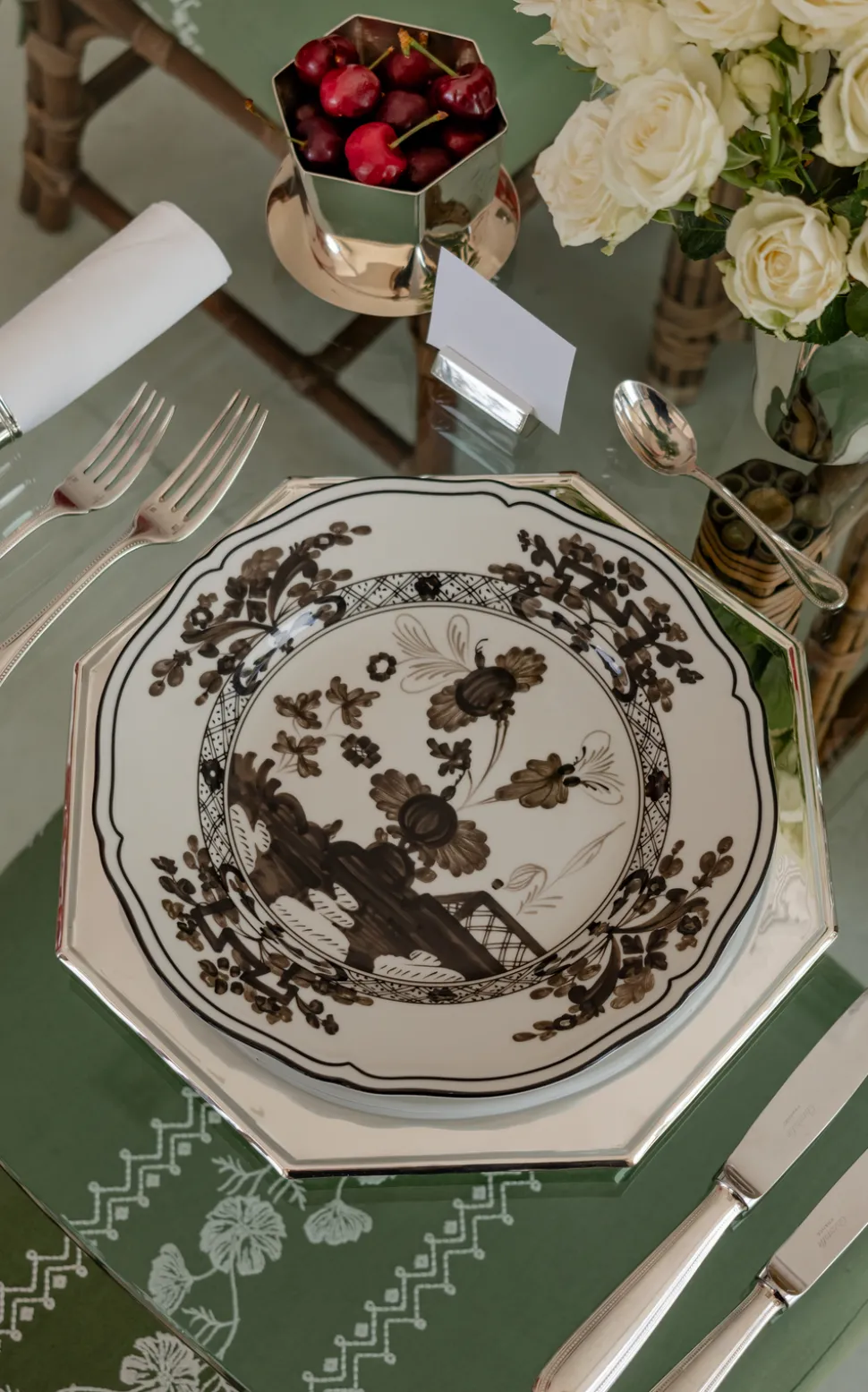 Esencial Hogar’s founder, Celina Wright, wants every gathering around the table to be a memorable one. What began as a small online shop based in El Salvador offering globally sourced treasures has developed into its own collection of table linens—with fabrics sourced from India and finished by hand in El Salvador—designed to elevate the everyday. The Hexagon Charger Plate frames dinner plates with sculptural elegance, its bold silhouette and polished silver-plated finish adding radiance to the table. Striking yet timeless, this versatile piece elevates casual lunches, festive gatherings, and candlelit dinners alike.