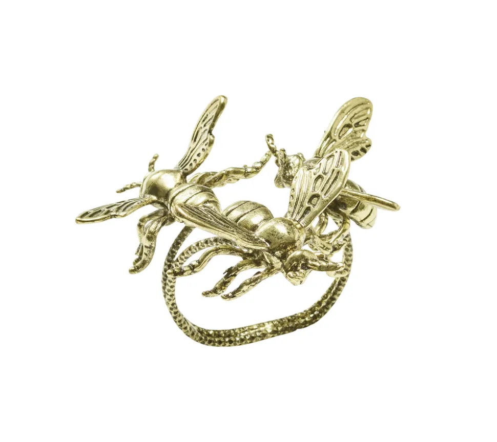 Kim Seybert designs artisan-made tabletop decor and luxury home accessories. Create a well-dressed dining look with the brand’s range of elegant tableware, placemats, runners, chargers, plates, napkins, flatware, and more. The Hive Napkin Ring in Gold, Set of 4 in a Gift Box features a trio of intricately detailed bees finished in varying shades of gold. These lifelike bees appear to dance and circle each other as they flutter around the napkin, creating a sense of movement. Welcome the warmer seasons with this stunning set of four metal napkin rings, much like the presence of bees welcomes the arrival of spring and summer.