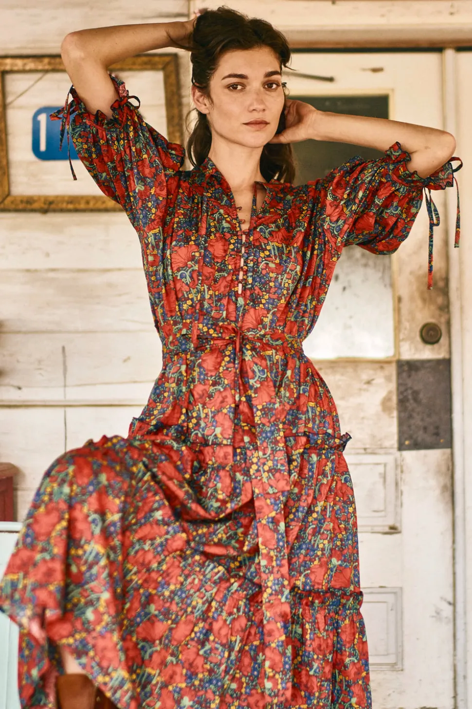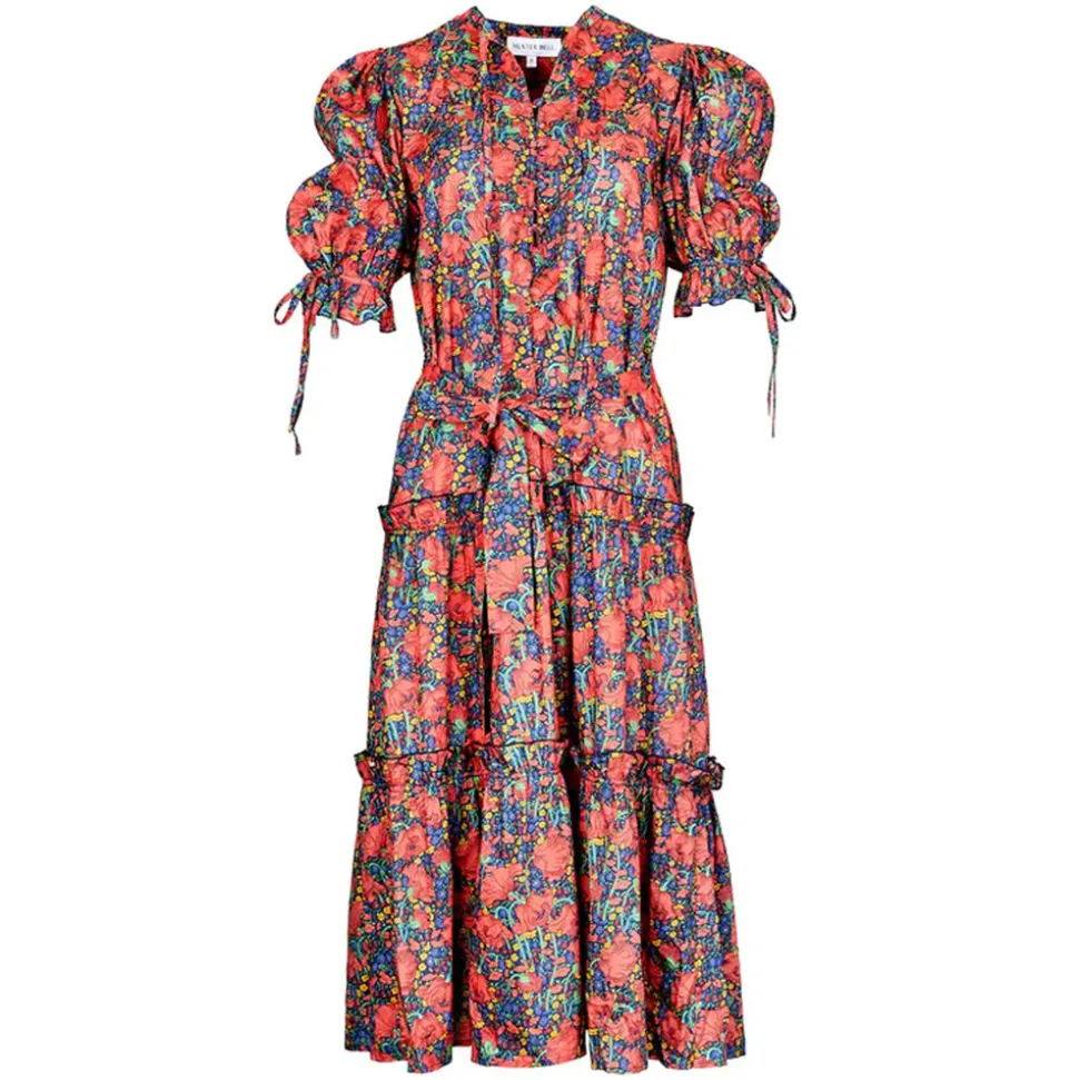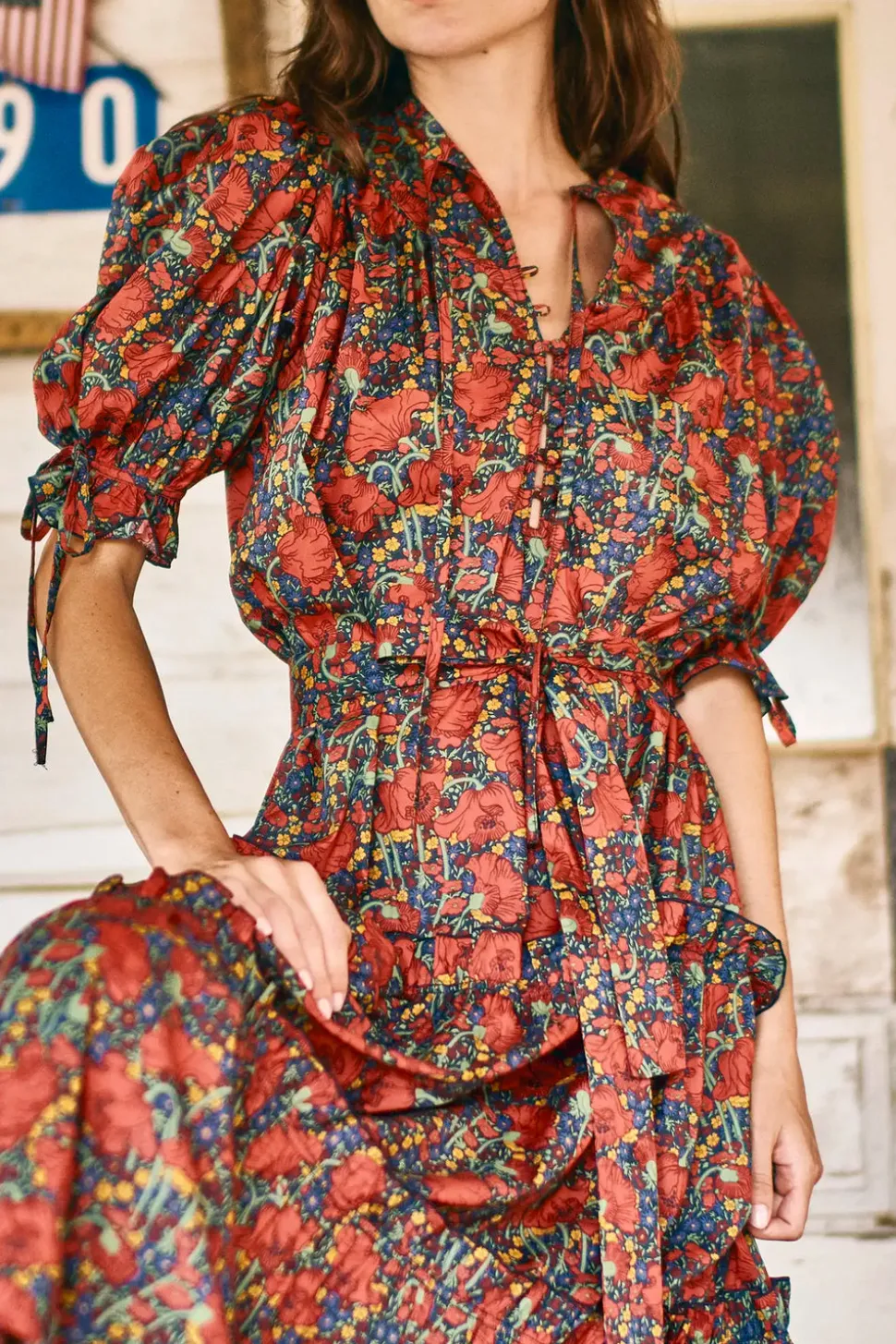 100% cotton poplin. Liberty fabric. Open v-neckline with tie detail. Button placket with gathering at yoke. Elbow-length puff sleeves with adjustable ties. Tiered seams with ruffle detail. Optional sash belt. Pull-over style. Midi length.