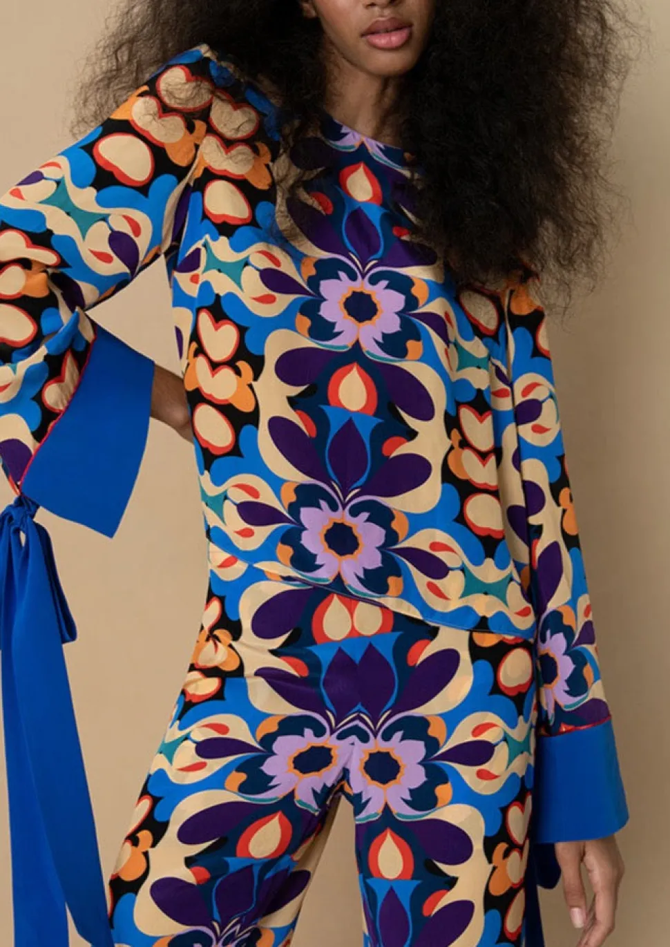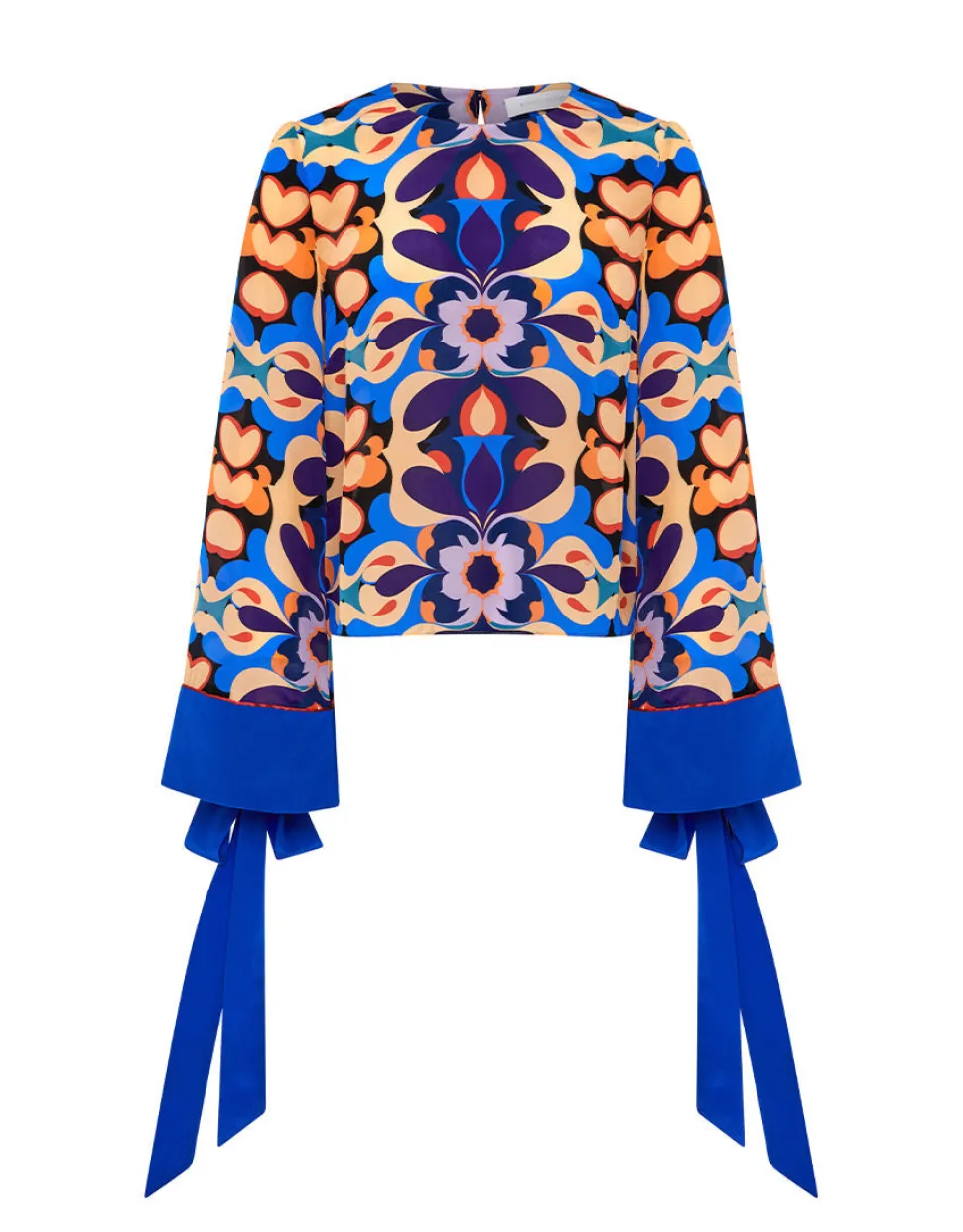 Inspired by the great art museums of the world, Carmen Borgonovo and Joana de Noronha use romantic silhouettes and surreal, bespoke prints, to create dresses that not only empower women, but transport them. These versatile, tailored pieces will bring joy to your wardrobe, and glamour to your world. With a flattering shape, the Honey Crepe Top in Seventies Blue features draping bow sleeve details.