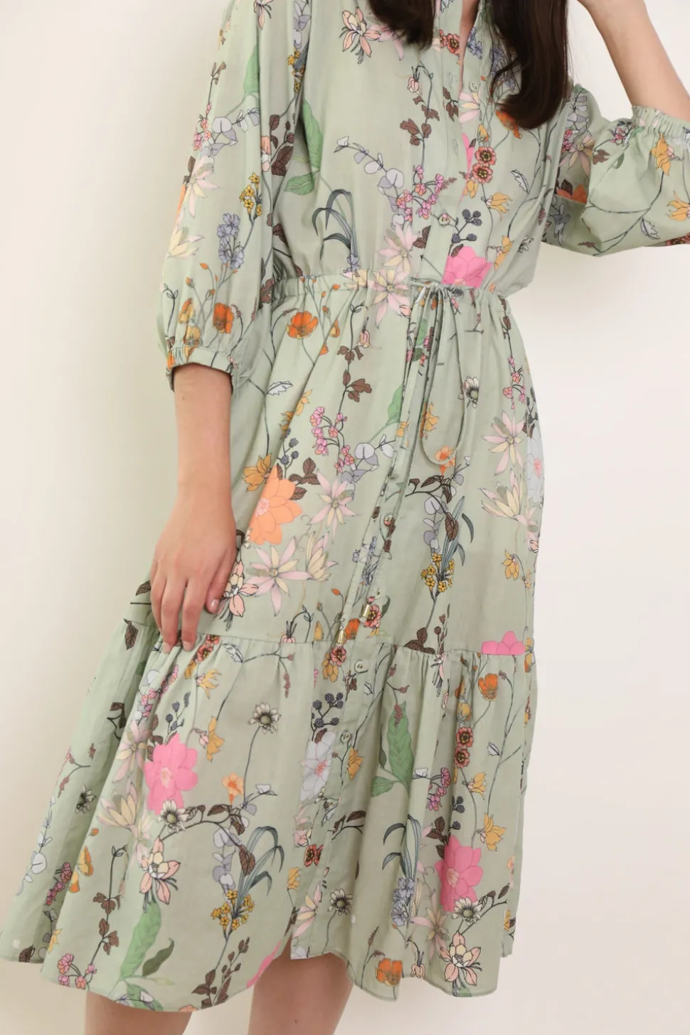 Crafted by artisans, every KAHORA design exudes an effortless charm that is vacation-ready. These timeless pieces are meant to be worn and adored for years to come. Intentional and thoughtful, materials are hand-selected for its quality and hand-cut to minimize waste. With elevated ease and a French-inspired print, the Honey Dress features a midi-length, tiered hem, beautiful covered buttons, crew neck collar, and tie waist with fanned ends. Like many of KAHORA’s signature fabrics, this dress is breathable and easily packable.
