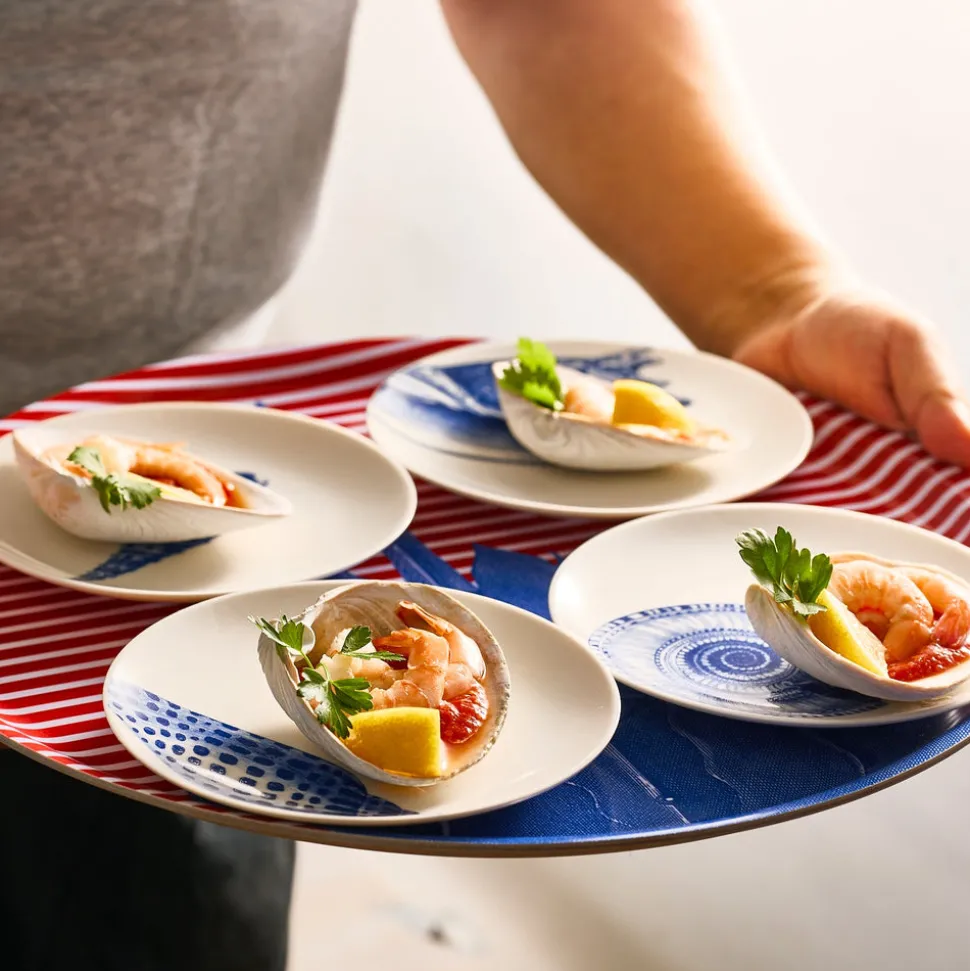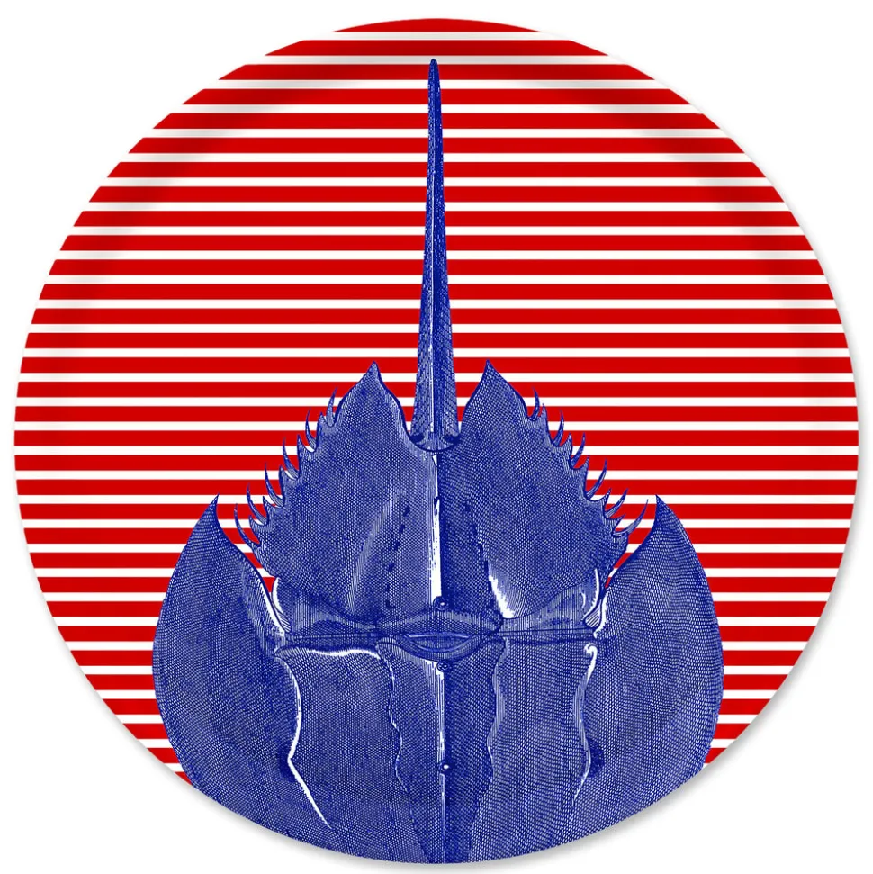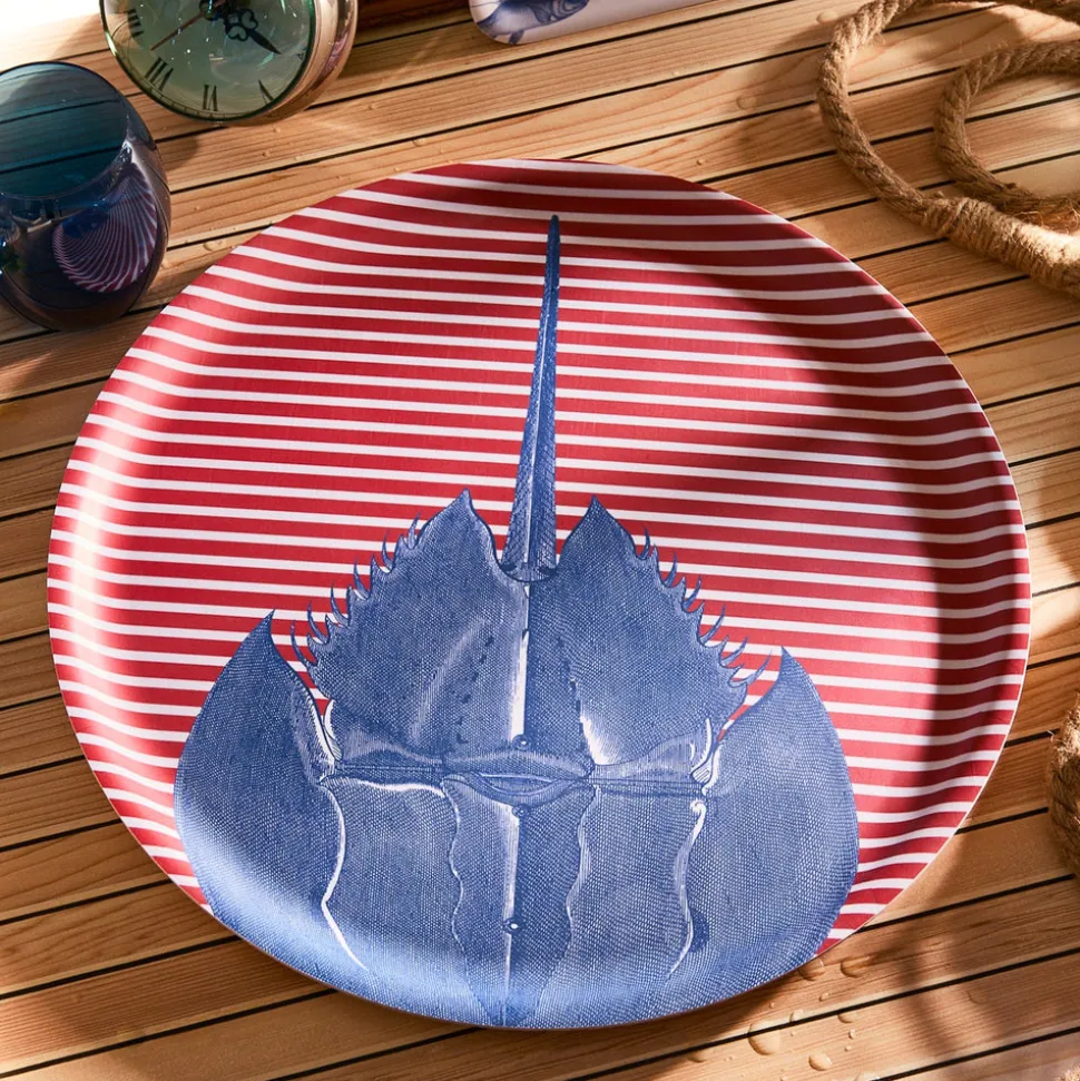 Caskata makes dinnerware for those who love to entertain. That joie de vivre and celebratory atmosphere makes its way into each piece of the brand’s blend of classic and contemporary designs, recognizable by their creative patterns, enduring quality, and light touch. These noble, ancient, sea creatures pre-date the dinosaurs, going back about 445 million years, and their unique biology has made them invaluable to science. What we really love, though, is their unique, graphic presence on this fun Horseshoe Crab Large Round Birchwood Tray. Offset with jaunty red stripes, this horseshoe crab says seaside fun in a bold, red, white and blue sort of way.