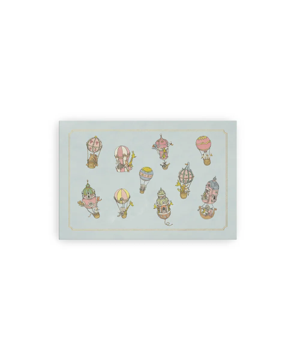 A new French maison for millennial families, Atelier Choux is a lifestyle brand that focuses on interior design in its bedding, textile accessories, wall décor, clothing, and collectible gift boxes. Inspired by Troisième Empire Parisian architecture, each item balances tongue-in-cheek humor with sophistication, revealed in recurring themes like elaborate buildings, simple charismatic animals, fanciful crests, and hot air balloons. The charming Hot Air Balloon Pop-Up Stationery Set includes 10, 300 gram pop-up invitation cards, featuring a whimsical Balloon in 3D with gold foil accents and 10 matching gold-foil envelopes. Each pop-up card features a blank space, ideal for thank you cards, invitations, or for everyday chic correspondences. Each handcrafted set includes a decorative sleeve, with cards on the right and matching envelopes on the left.