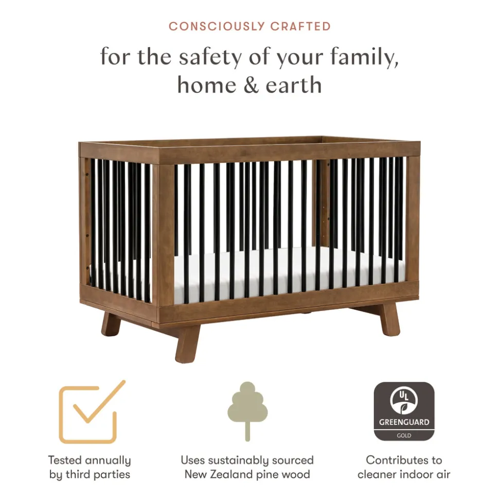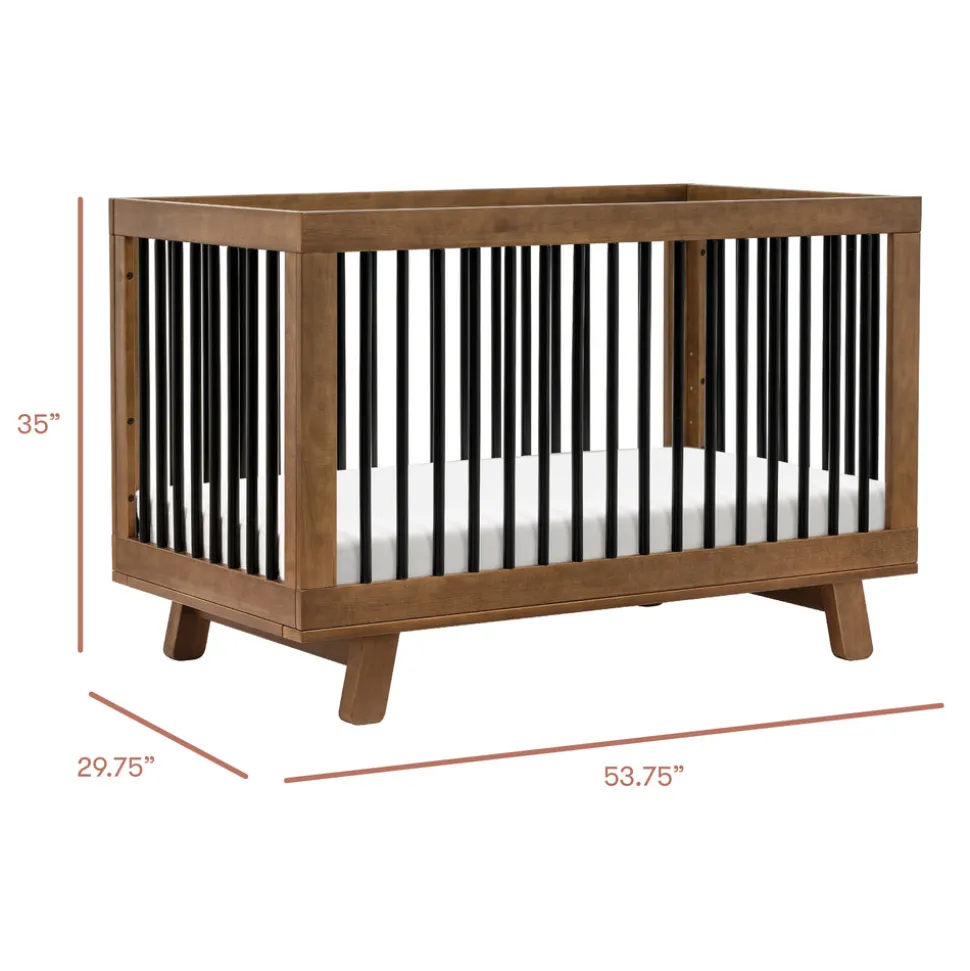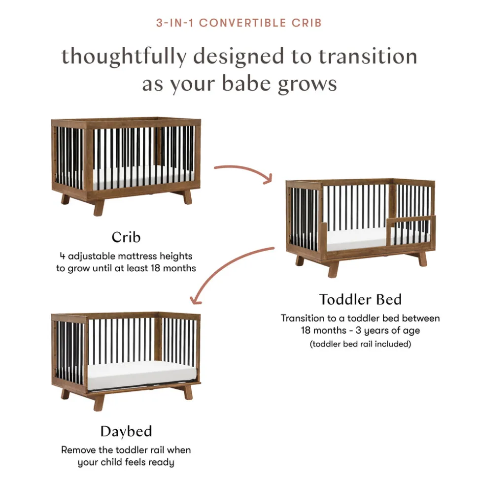 Designed in Los Angeles, babyletto creates stylish, modern nursery furniture with a focus on safety, sustainability, and intuitive design. For over a decade, the brand has empowered parents to craft spaces that reflect their values and individuality. The Hudson 3-in-1 Convertible Crib with Toddler Bed Conversion Kit in Natural Walnut/Black is a babyletto icon, beloved for its clean, modern aesthetic and flexible design. With rounded spindles, a solid frame, and flared feet, this crib converts to a toddler bed and daybed with the included conversion kit—growing stylishly with your child.