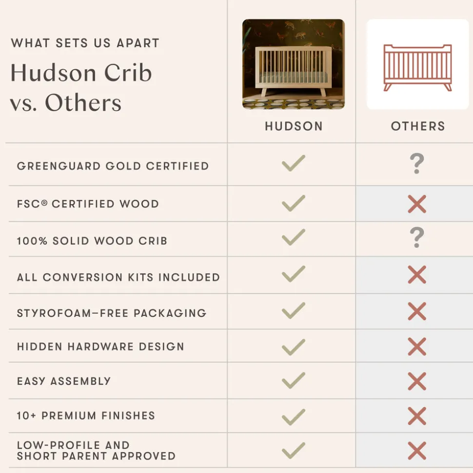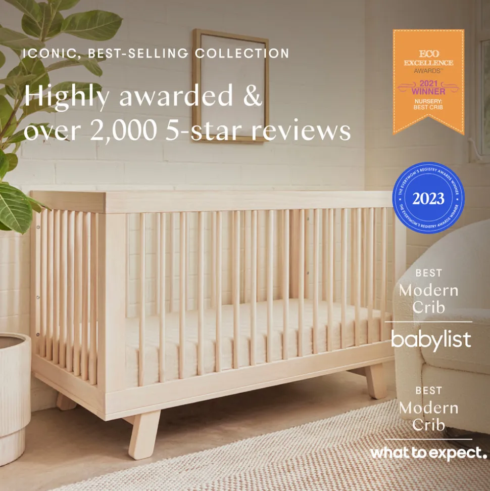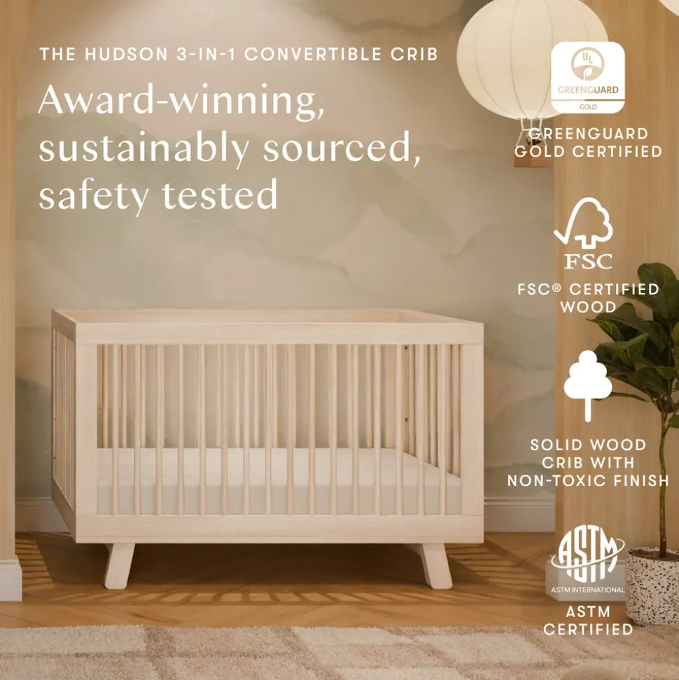 Designed in Los Angeles, babyletto creates stylish, modern nursery furniture with a focus on safety, sustainability, and intuitive design. For over a decade, the brand has empowered parents to craft spaces that reflect their values and individuality. The Hudson 3-in-1 Convertible Crib with Toddler Bed Conversion Kit in Washed Natural is a longtime parent favorite, known for its clean, modern design with rounded spindles, a solid frame, and flared feet. With an included conversion kit, this crib transitions seamlessly into a toddler bed and daybed to grow with your child.