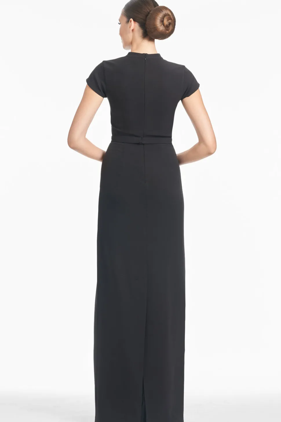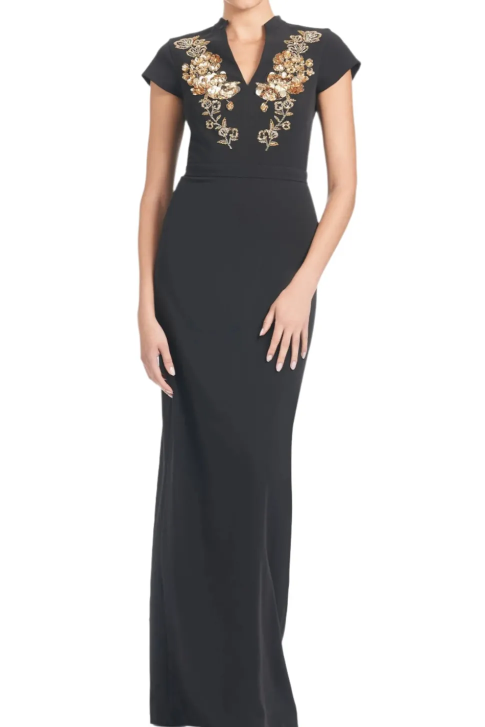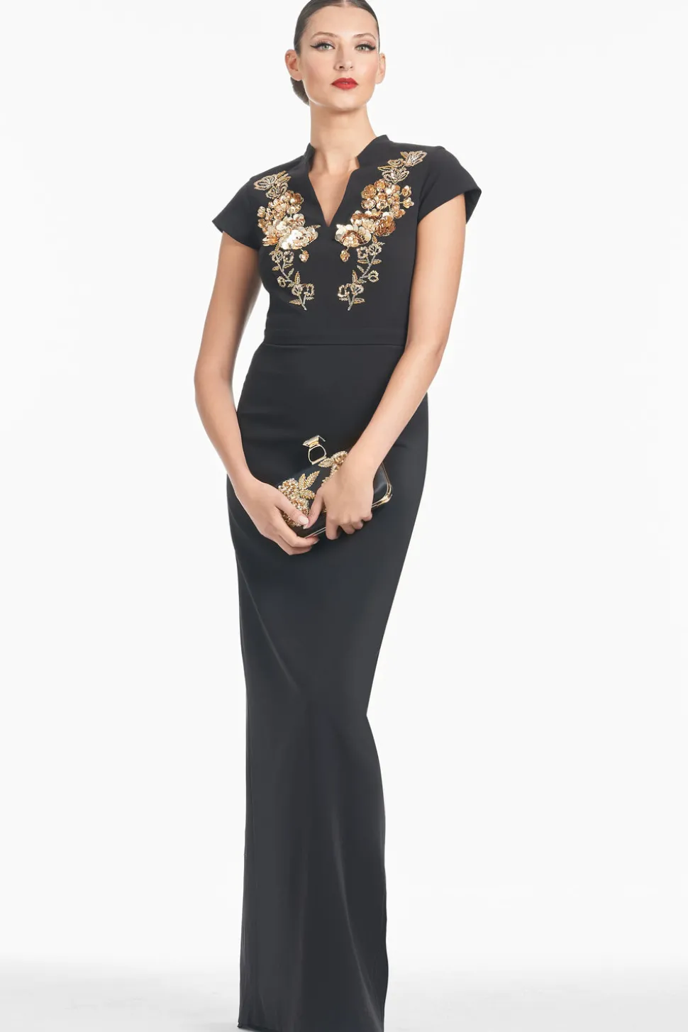 Born in India, Sachin and Babi bonded at New York’s Fashion Institute of Technology and launched an embroidery business, working with top houses, like Oscar de la Renta, and Manolo Blahnik. Today, the brand works with their own factory in Mumbai, controlling quality at every stage, and producing womenswear that is at once unique, beautiful, and wearable. The Hudson Gown in Black embodies quiet luxury and timeless style. The floor-length silhouette is inspired by the impeccable tailoring of a “shirt style” fit. The incredibly flattering silhouette is made exquisite with the gold embellishment throughout the bodice.