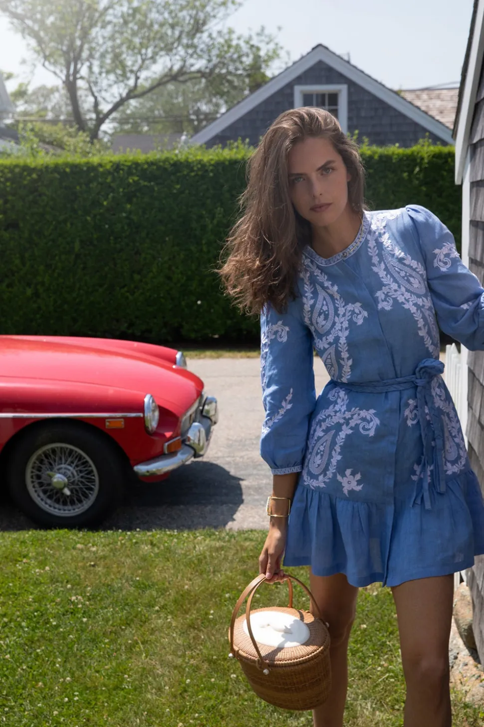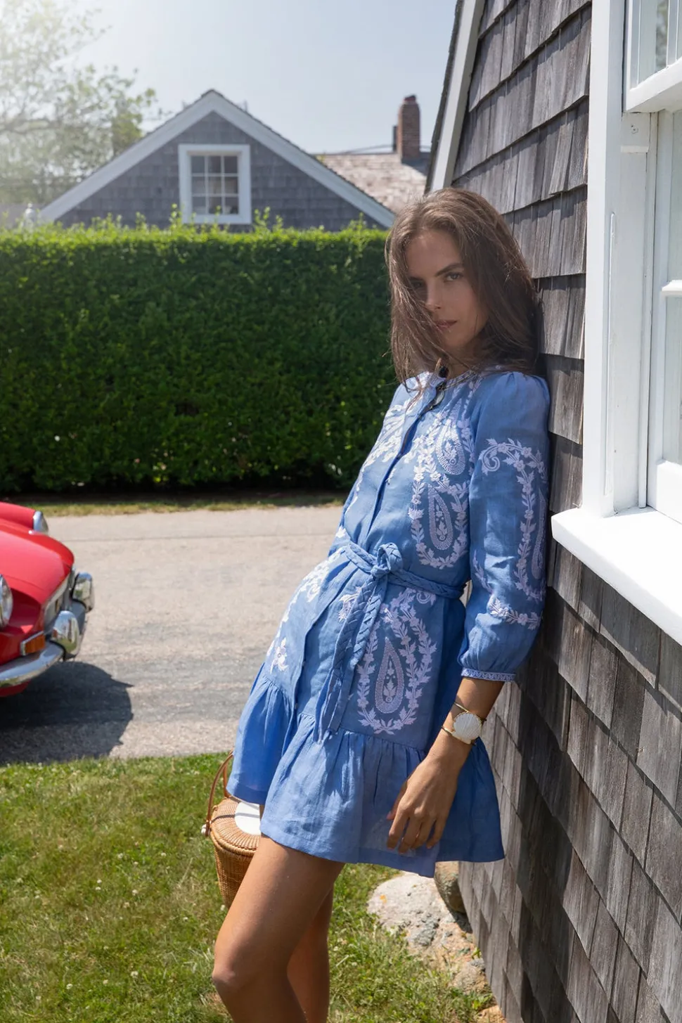 Inspired by art, architecture, and the founder’s global journeys, ASHA by Ashley McCormick introduces bold, sophisticated jewelry and accessories made from only the finest materials. From everyday glamour to the red carpet, these statement pieces are classic additions to your collection. The Hydrangea Imogen Tiered Mini Dress in blue linen exudes effortless chic, featuring oversized white paisley embroidery cascading down the front and sides. Billowy sleeves and a tiered silhouette add a feminine touch, while the braided belt cinches the waist for a flattering fit.
