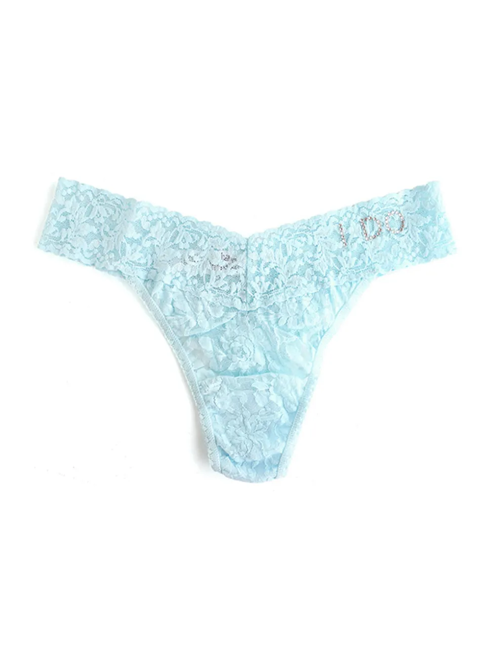 Hanky Panky’s signature V-front and V-back waistband revolutionized the world of lingerie 30 years ago and has put an end to panty-lines. Soft and stretchy, Hanky Panky officially makes the World’s Most Comfortable Thong. Fitting high on the hips and easily transported, the brand’s famous thong gets a wedding night upgrade with “I Do” embellishment in European crystals on the lace waistband of the I Do Crystal Signature Lace Original Rise Thong. As comfortable as they come, make your special night even more so.