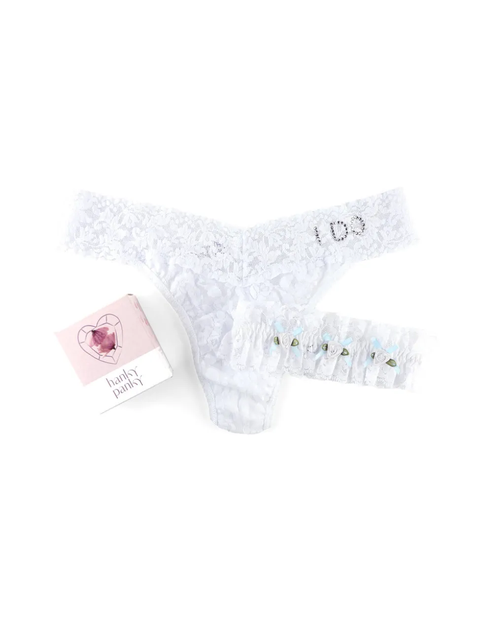 Hanky Panky’s signature V-front and V-back waistband revolutionized the world of lingerie 30 years ago and has put an end to panty-lines. Soft and stretchy, Hanky Panky officially makes the World’s Most Comfortable Thong. Fitting high on the hips and easily transported, the brand’s classic thong, accentuated by “I Do” embellishment, finds its way into the I Do Original Rise Thong & Garter Box Set, along with a lacy garter, crafted in stretch fabric and featuring a sweet little bow. Sexy, playful, and comfy as can be, your wedding just became even more special.