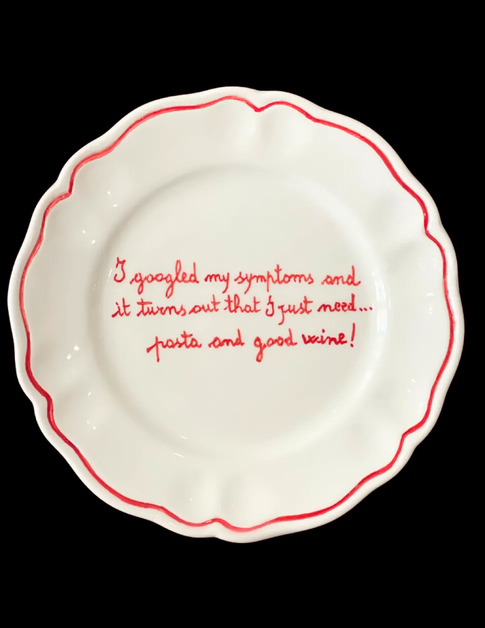 London-based Sveva Clavarino, whose Wellness Reporter platform offers everything from luxury trips to natural skincare products, curates Sveva’s Home from her experiences traveling the globe. The refinement of her handmade, artisanal ceramics and tabletop items is balanced by cheeky expressions, guaranteed to delight your guests. Individually personalized, the I Googled My Symptoms and It Turns Out I Only Need Good Pasta and Good Wine Scalloped Plate, Set of 6 lays the table with a wink, a nod, and a hilarious, contemporary commentary.