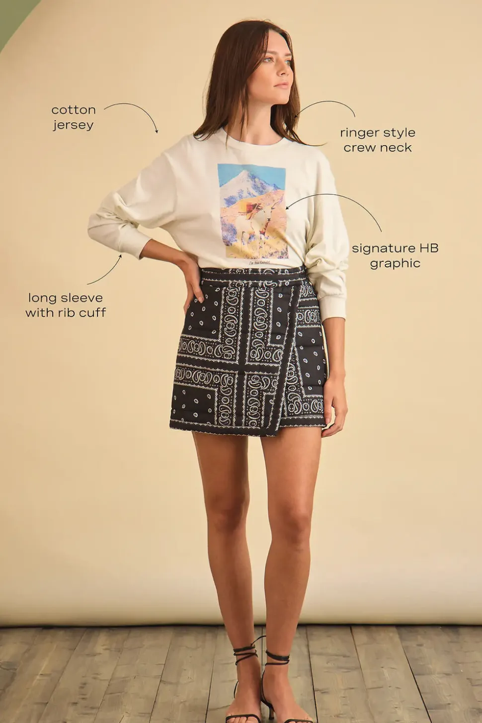 Hunter Bell strives to spark joy and inspiration with clothing that empowers women to embrace their personal style. The New York City–based brand is all about fashion-forward, fun looks, designed with detailed craftsmanship and exceptional wearability. The “I’m That Cowgirl” Long Sleeve Tee is soft enough to sleep in yet bold enough to make a statement. Designed with a vintage-inspired ringer crew neckline, long sleeves with ribbed cuffs, and a playful graphic across the front, it’s crafted from the softest cotton jersey for all-day comfort. Style it with the Powell Skirt in any of this season’s bandana prints, or pair it with denim for casual days and cool nights.