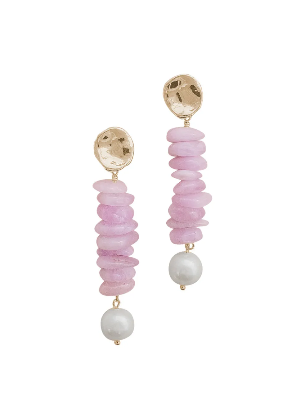 Kunzite and freshwater pearls. Gold-plated post with butterfly closure. Handmade in Newport, Rhode Island.