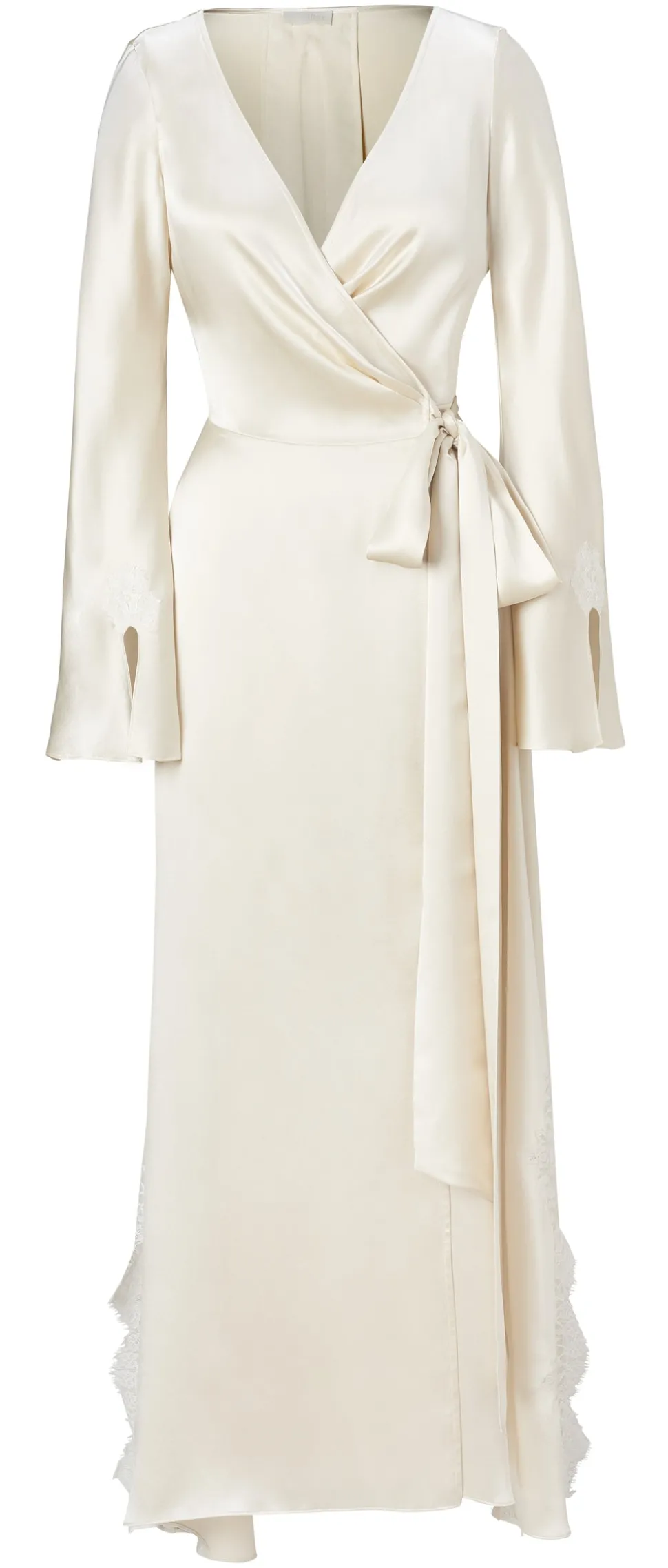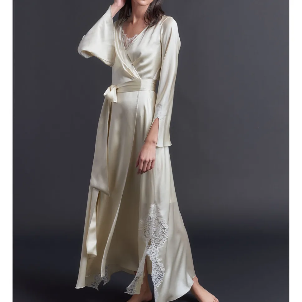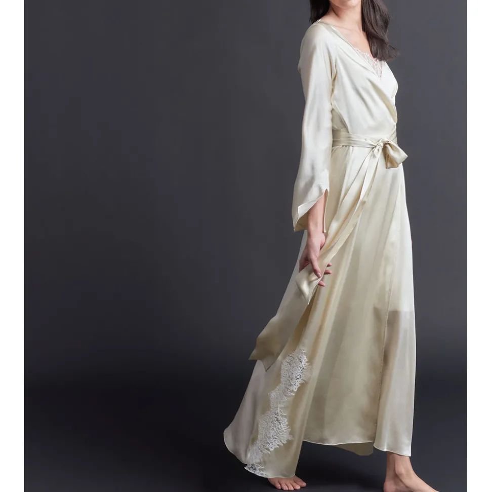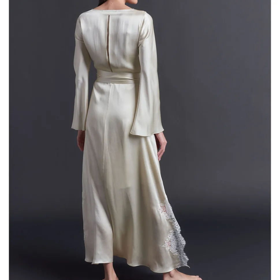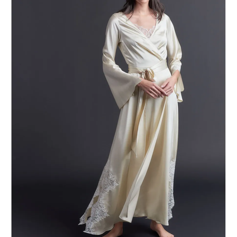 The Iris Pearl Silk Charmeuse Wrap Robe brings glamour to the boudoir with fluttering sleeves and a long length. The wrap style allows for the ties to be in the back or the front. The slit sides add a bit of drama in motion, as the back flares out in a lovely way. The slit sleeves allow the wearer to easily move through the morning, while keeping them safely out of the way. The delicate French bouquet lace applique is both stunning and feminine, and the lace insert in the back gusset allows just a hint of skin.