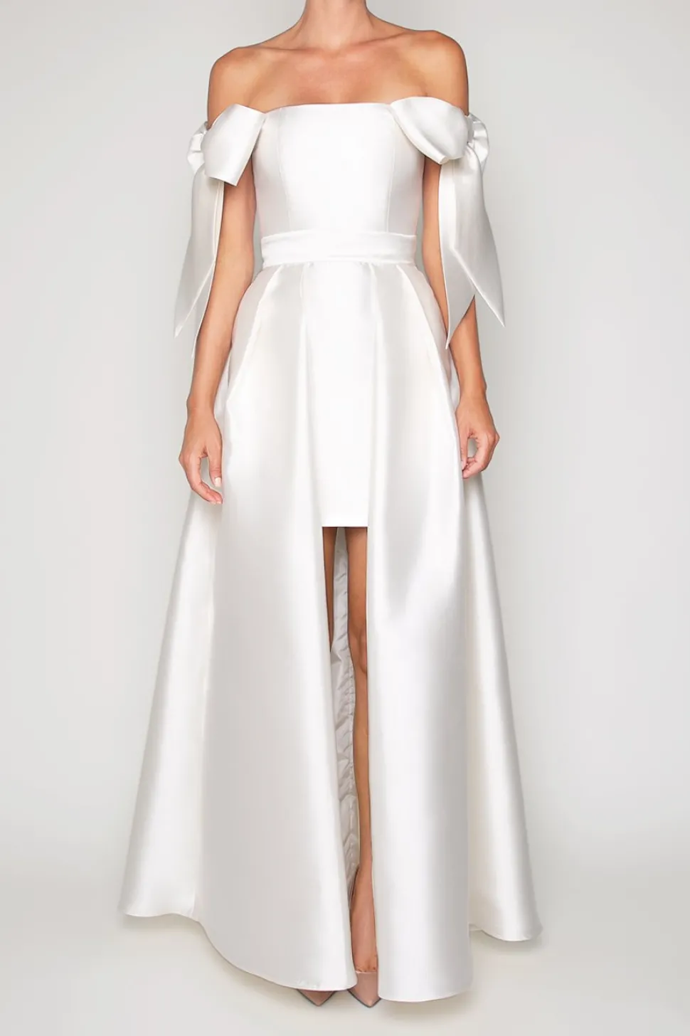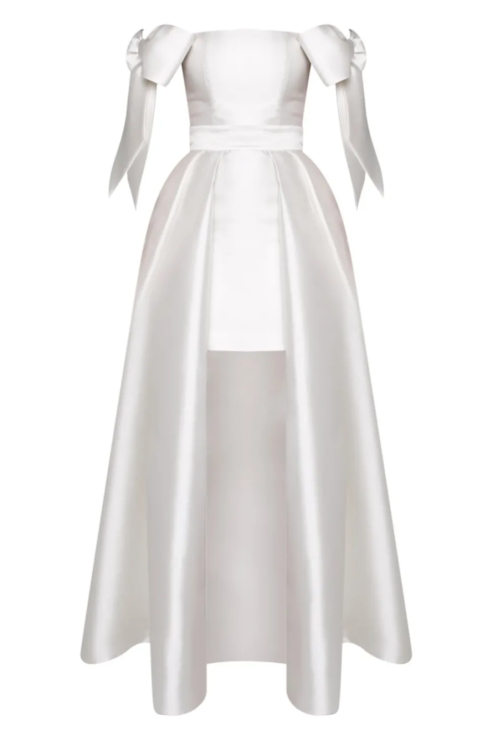 51% silk and 49% wool shell. 100% polyester lining. Removable overskirt with side seam pockets. Midi pencil skirt with back slit. Fitted bodice with boning. Bows on sleeves. Seam at natural waist. Fully lined. Concealed back zipper with hook and eye closure. Made in the USA.