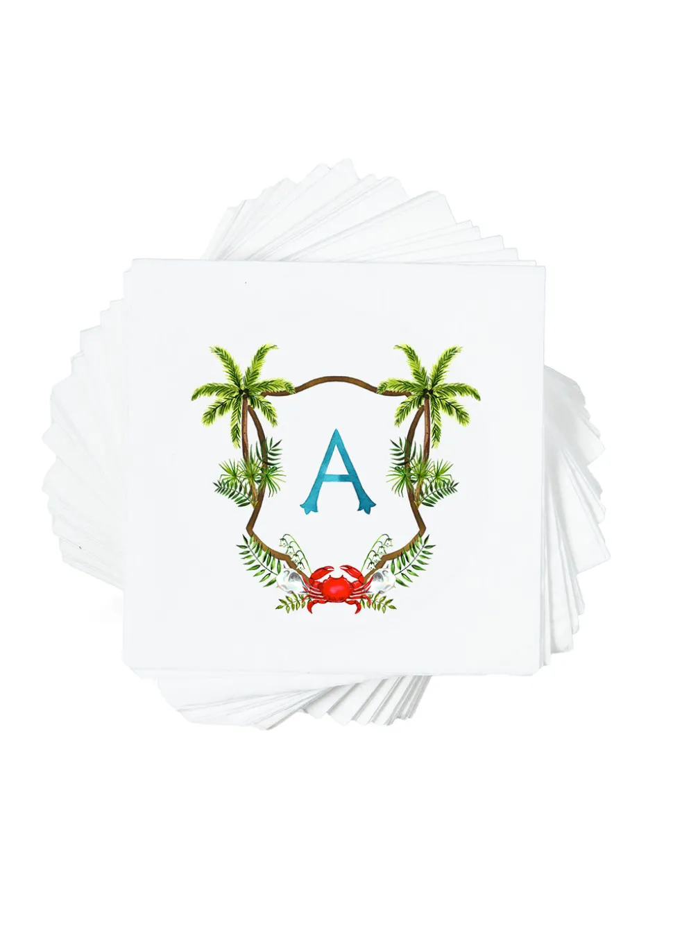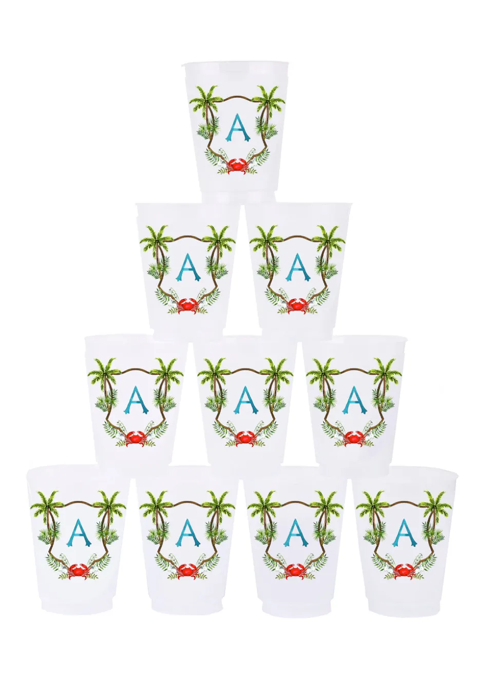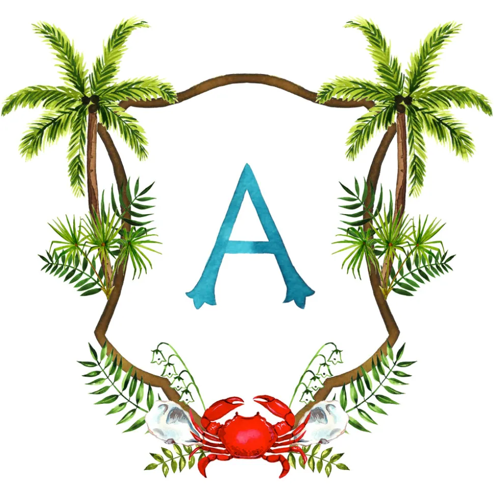Launched in 2020 by Alexandra Pijut, Thistle and Briar Studio was born of her lifelong love of art and the desire to create hand-painted, whimsical designs for clients to cherish. Elevate your wedding, bachelorette, or special event with a personalized crest that is certain to leave a lasting impression. This exclusive Over The Moon x Thistle and Briar Studio crest features palm trees, a crab, palm fronds, and oysters, inspired by the laid-back aesthetic of the low country. Personalize this design with your initial, which will stand out on these cups, cocktail napkins, and patch sweatshirts. Now it’s your party.
