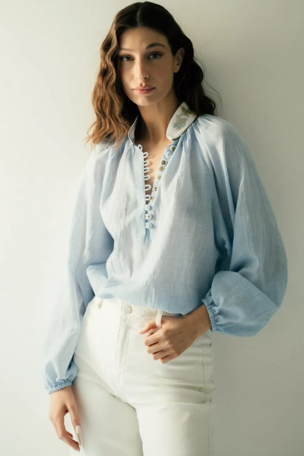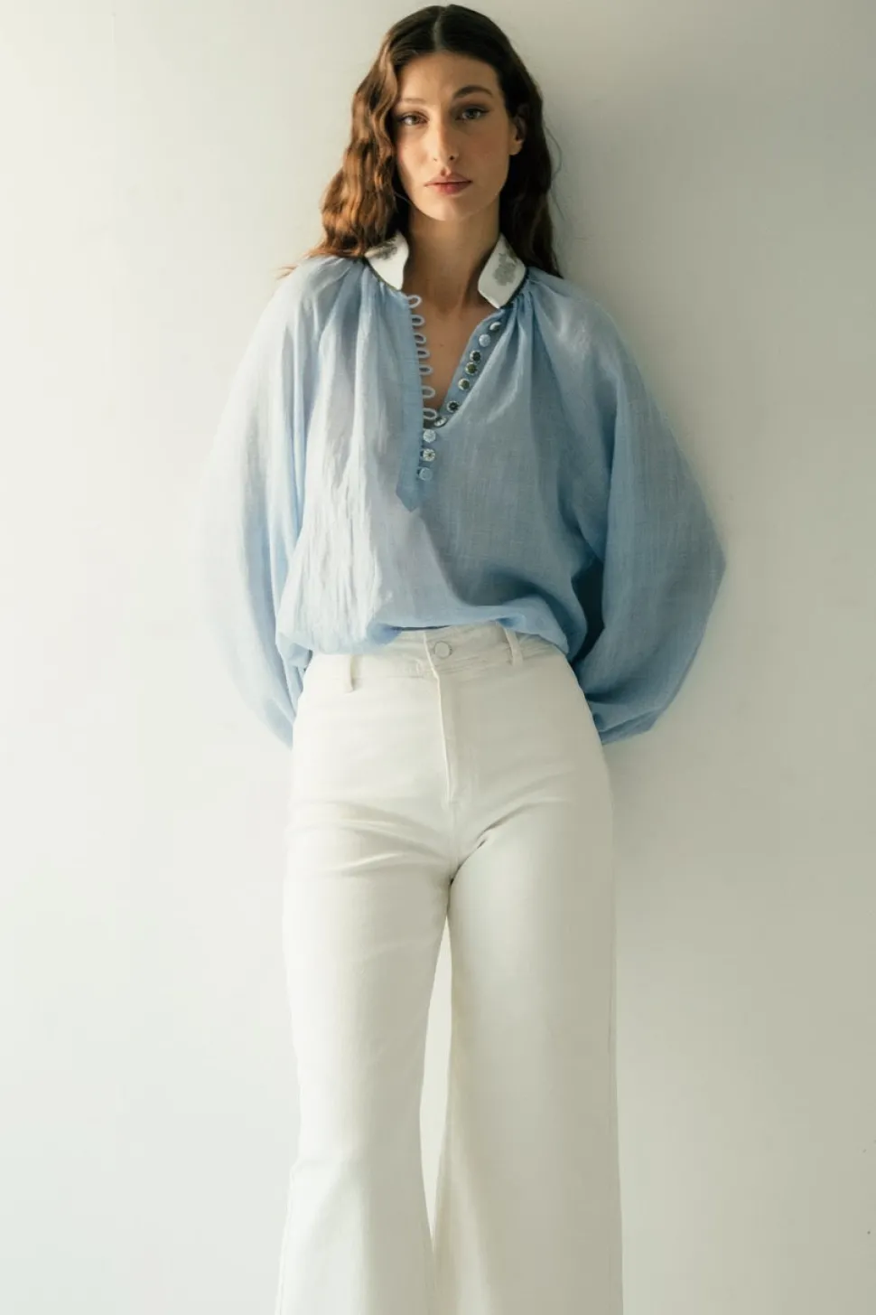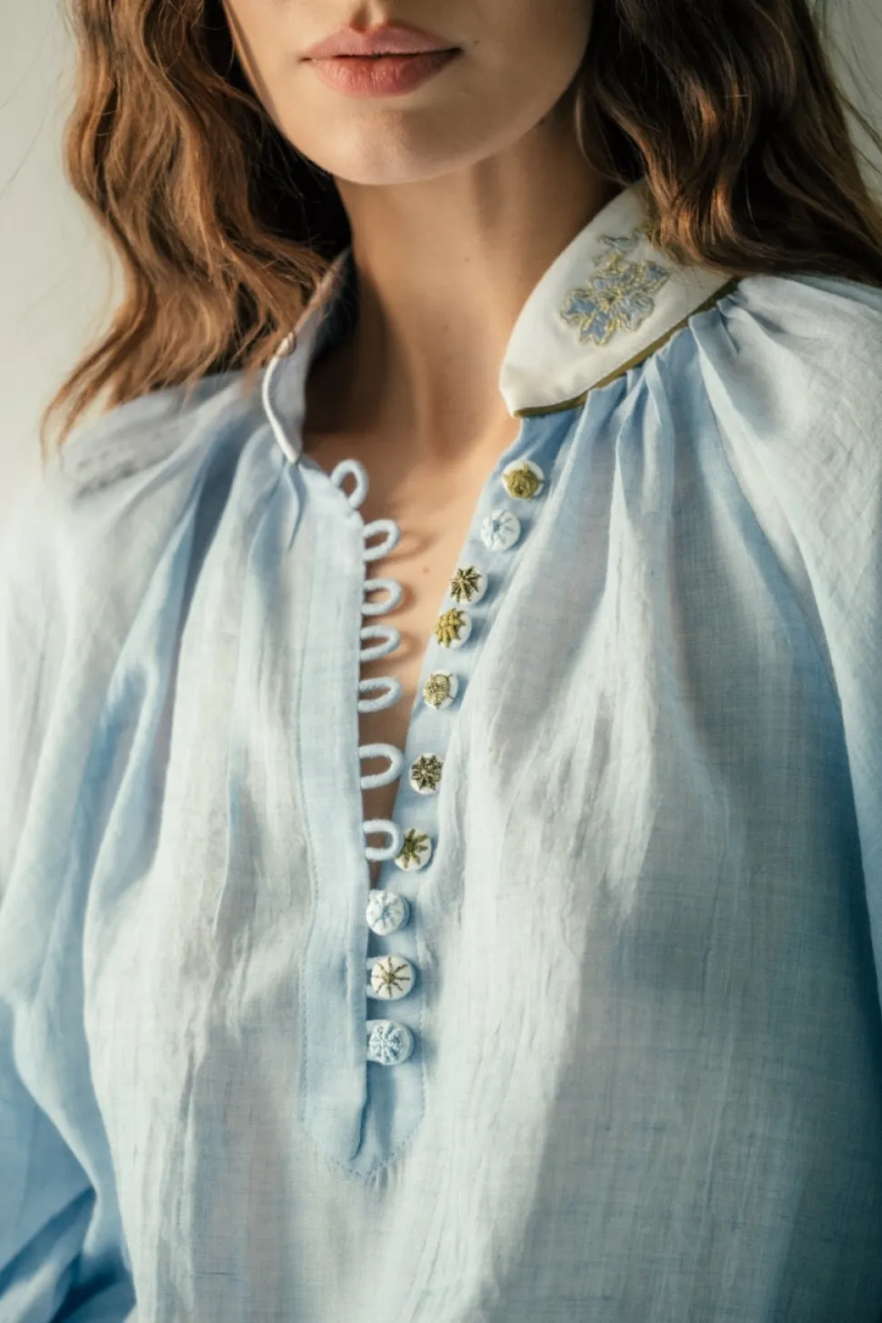 The brainchild of dynamic Iranian mother-daughter duo, Roshanak Varasteh and Leily Amirsardary Ahmed, RosewaterHouse is more than a fashion label; it is a testament to heritage, artisanal craftsmanship, and timeless design. Drawing inspiration from their cherished family heirlooms, Roshanak and Leily pay homage to the rich cultural tapestry of the Middle East, working exclusively with local artisans who breathe new life into age-old techniques, crafting exquisite, limited-edition garments that transcend age, style, and trends. These pieces are sure to become some of your most treasured. Every wardrobe needs a blouse that’s elevated, effortless and feels great to wear. That’s why we love the Ivy Blouse in Blue & White. Made from a super soft cotton voile—ideal for tucking and wearing loose—this top features extra special details like handmade gold and silk thread embroidered along the collar and covering the buttons. The sleeves are elasticated at the wrist so you can scrunch your sleeves as you please.