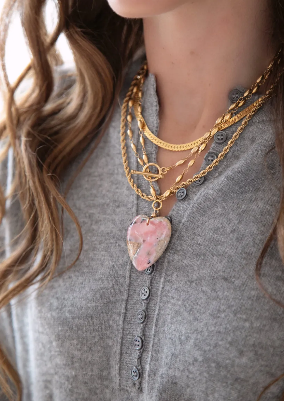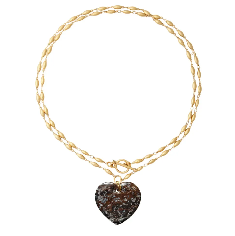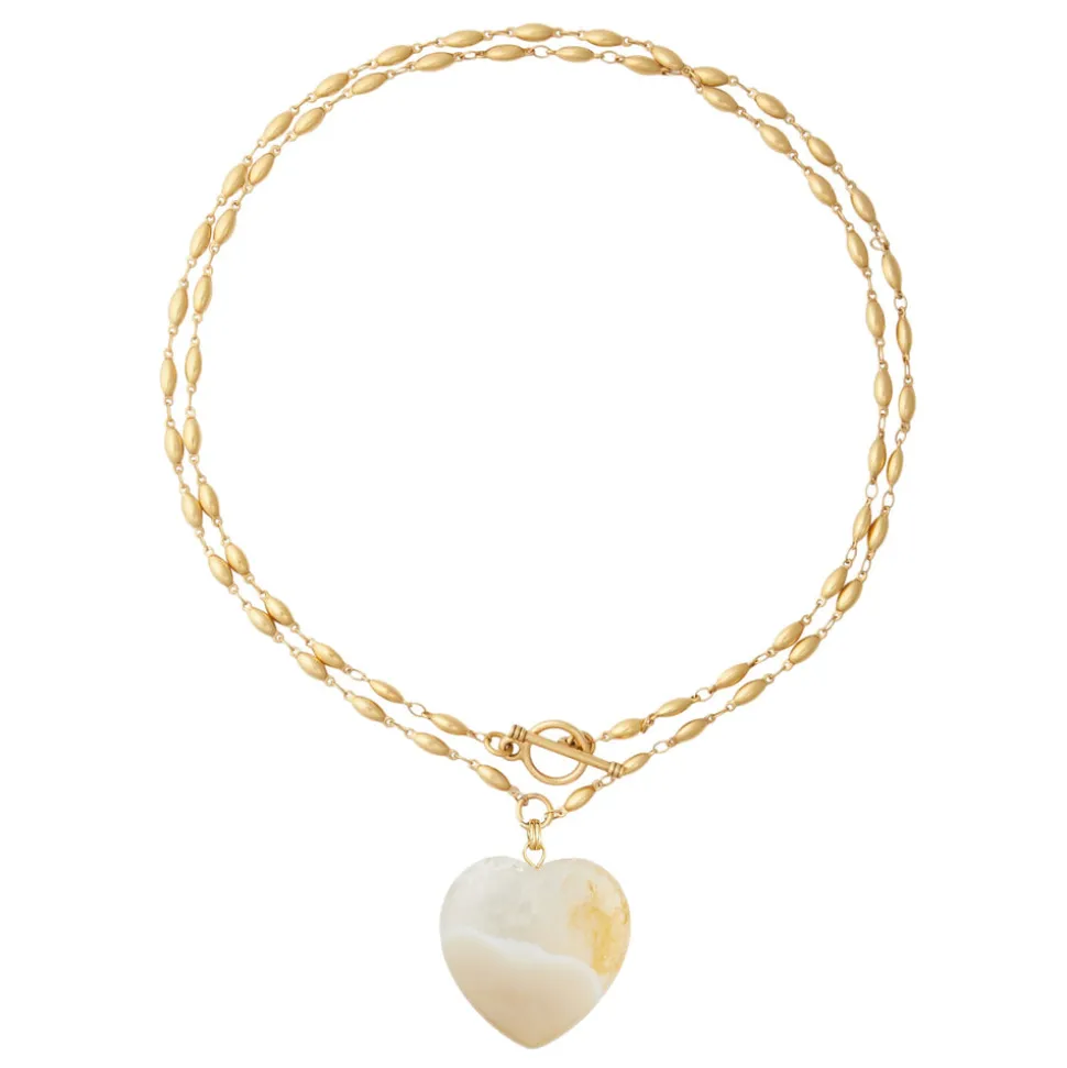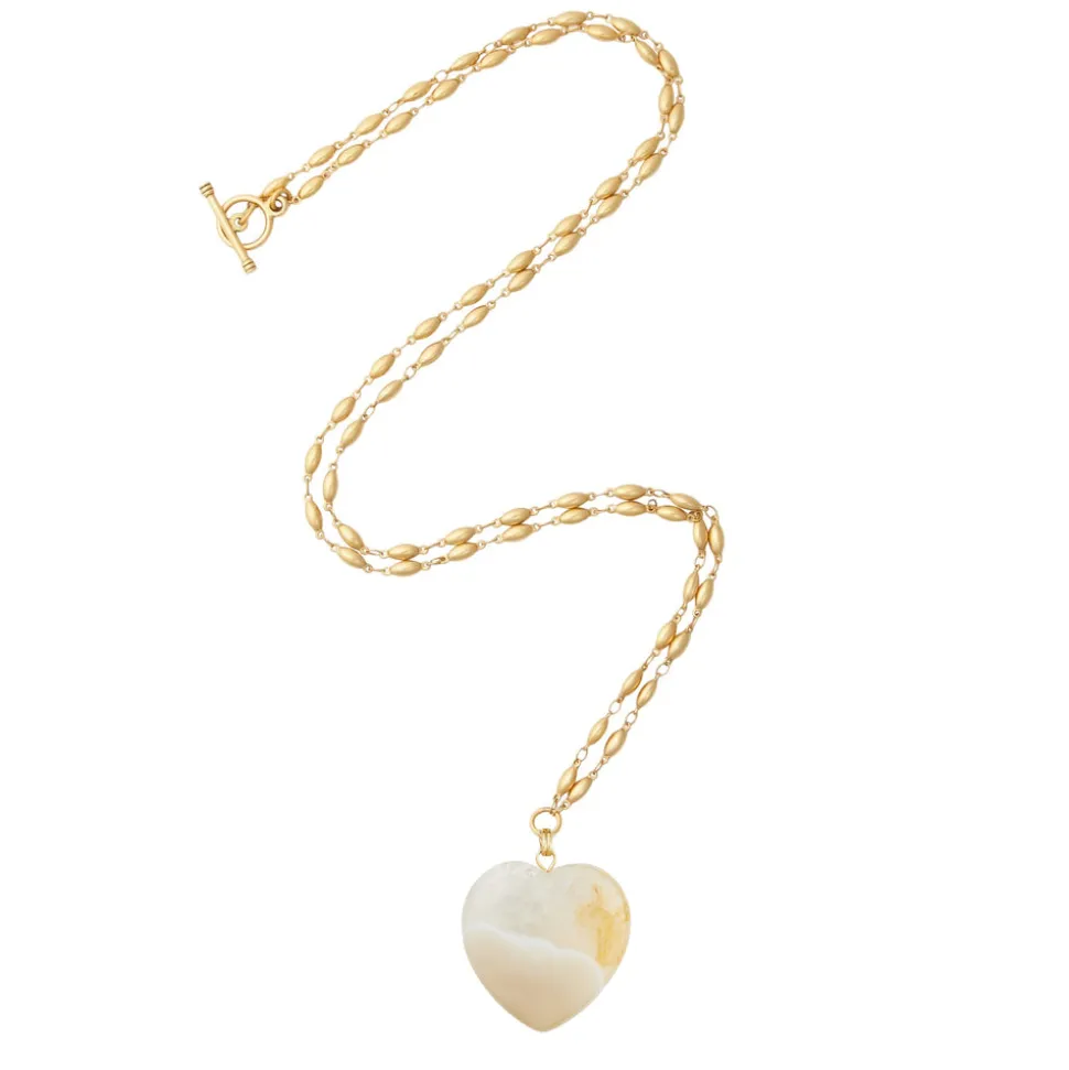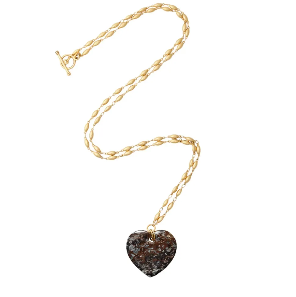 24K antique gold plated chain. Polished pink opal gemstone heart or a polished gray agate gemstone heart. Toggle closure.