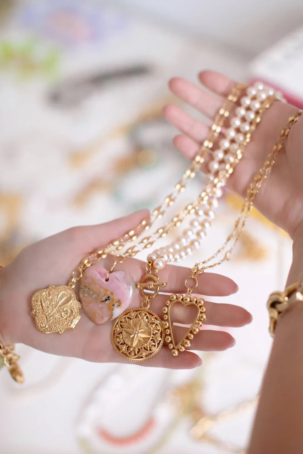 The mother-daughter duo behind Brinker + Eliza combine their experience in metalsmithing and fashion to create incredibly unique jewelry that feels custom-made. Employing pearls, shells, and earth’s most prized organic forms, these are pieces to be not just worn but treasured. The Izzie Necklace features your choice of polished pink opal or gray agate gemstone hearts. No two gemstones are exactly alike, making every Izzie one of a kind.