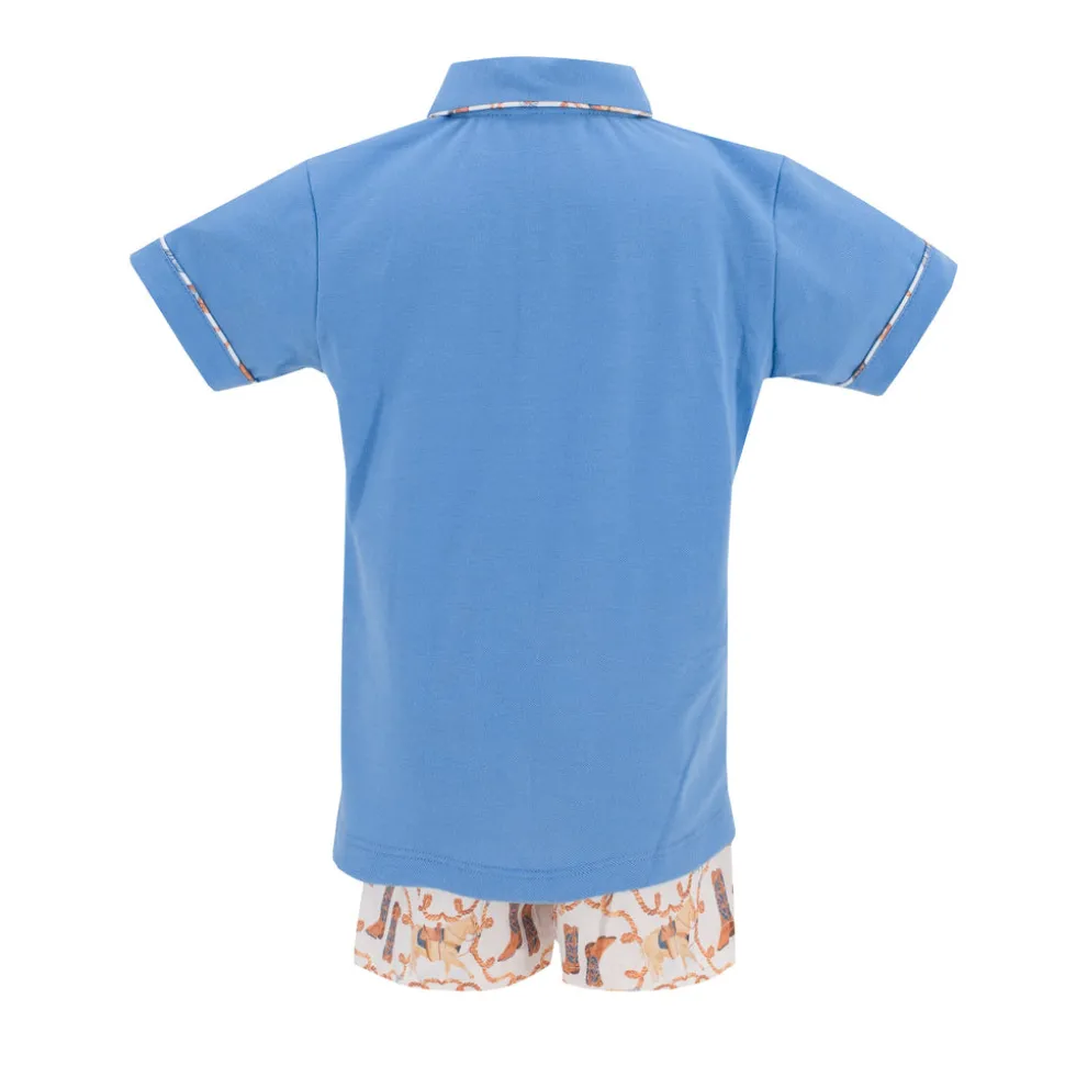 Crafted from Spanish cotton fabric. Two-piece set includes polo and pull-on shorts. Contrasting trim on collar and sleeves. Embroidered boots and hat on chest. Made in Colombia.