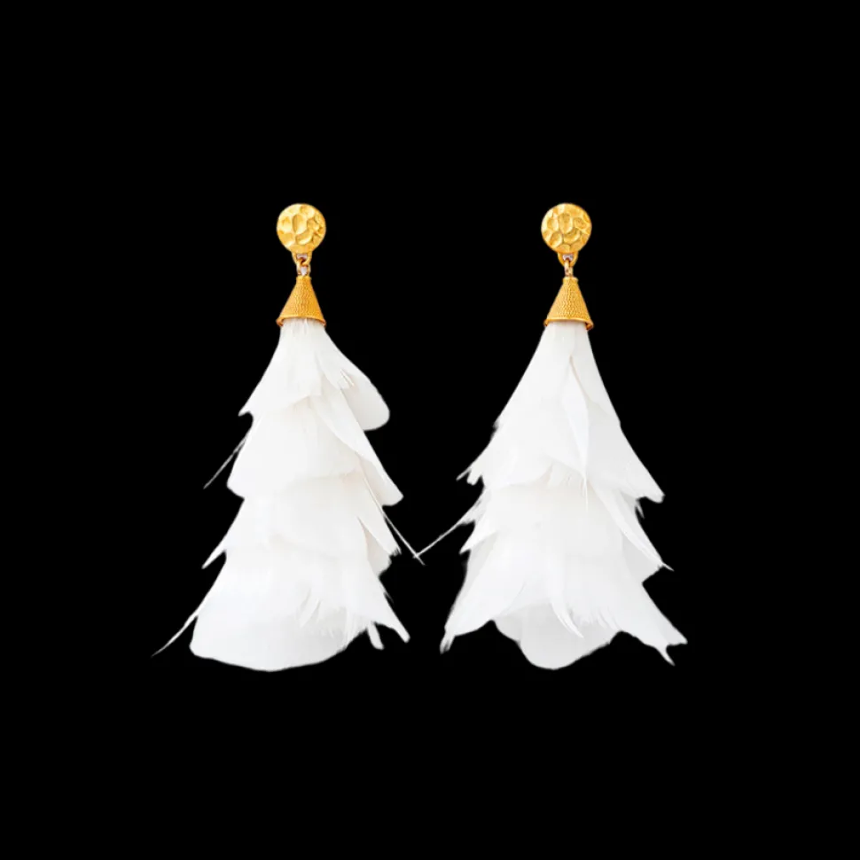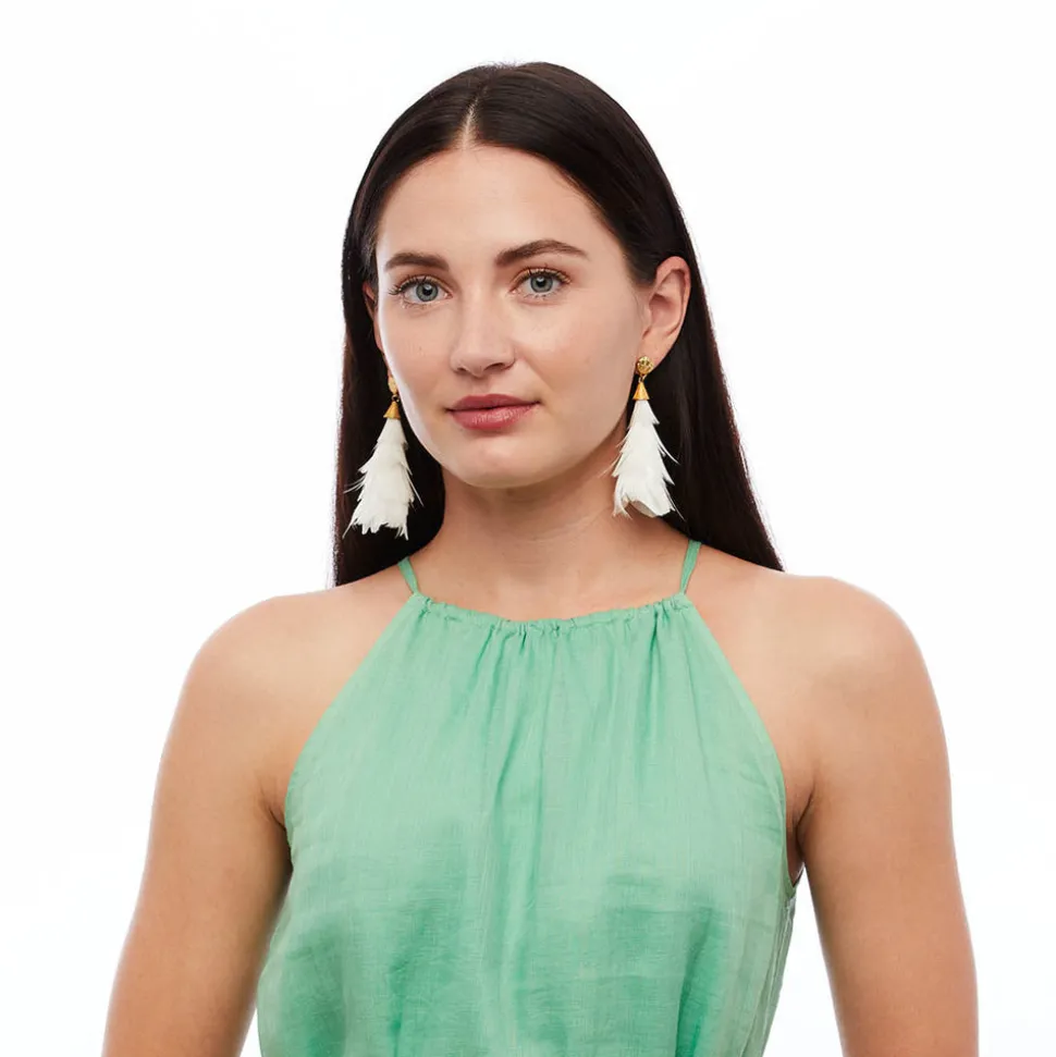 24k gold plated studs with post push back. Feathers and other materials for each pair of earrings are hand-selected giving each pair a unique coloring. All feathers used are all-natural and sustainably sourced. Every feather is hand selected by our artisans, making no two pieces exactly alike. Suitable for sensitive skin (nickel-free and lead-free)