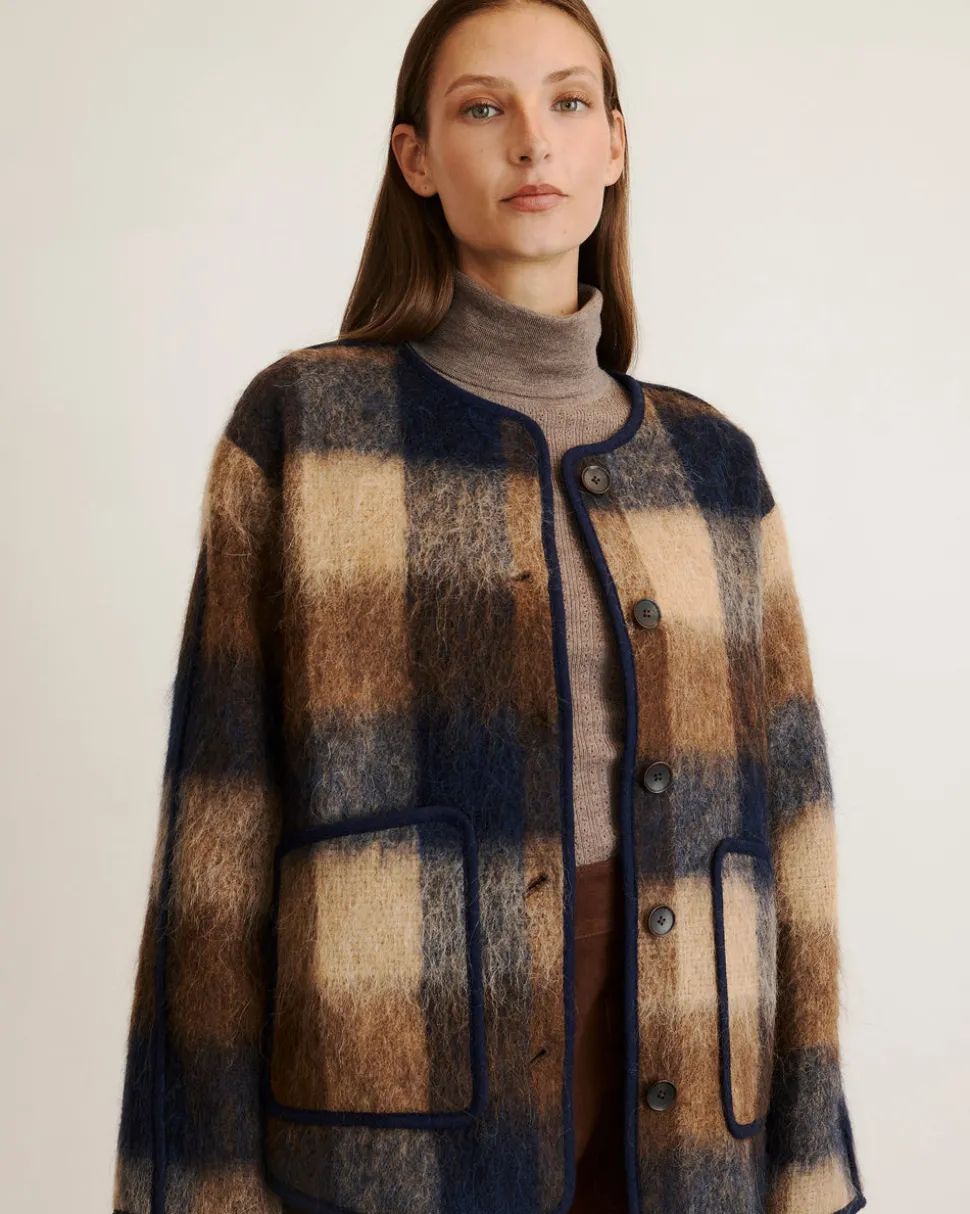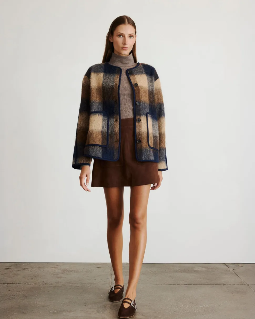 Creating clothing that inspires confidence, celebration, and community, Tanya Taylor is a New York-based womenswear brand whose mission is to provide practicality and style to a range of ready-to-wear in inclusive sizes. Each collection is thoughtfully designed through the artful use of color, texture, and original hand-painted prints. The Janet Jacket in Toffee Multi is a statement plaid barn jacket crafted in an alpaca-blend wool, reimagining classic outerwear with a modern twist. Featuring a button-up front, slightly oversized fit, and practical front pockets, the Janet Jacket offers effortless layering for the season. Pair it with the Kayden Turtleneck and Fran Skirt for a fall look that transitions seamlessly from day to evening.