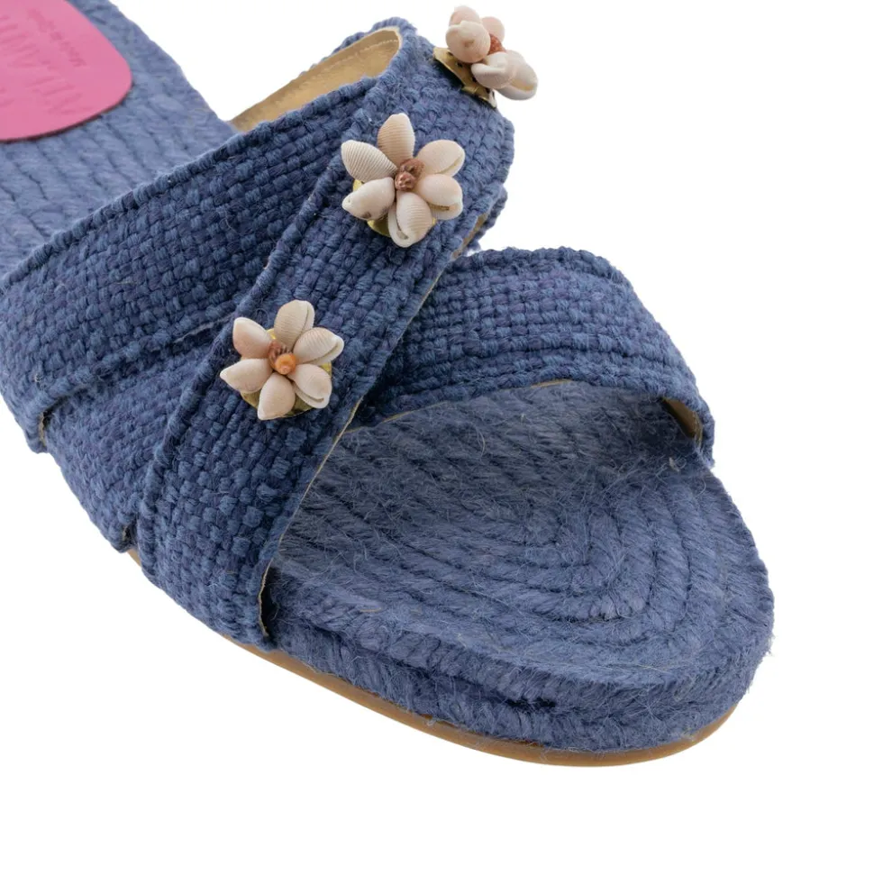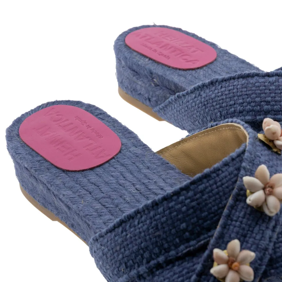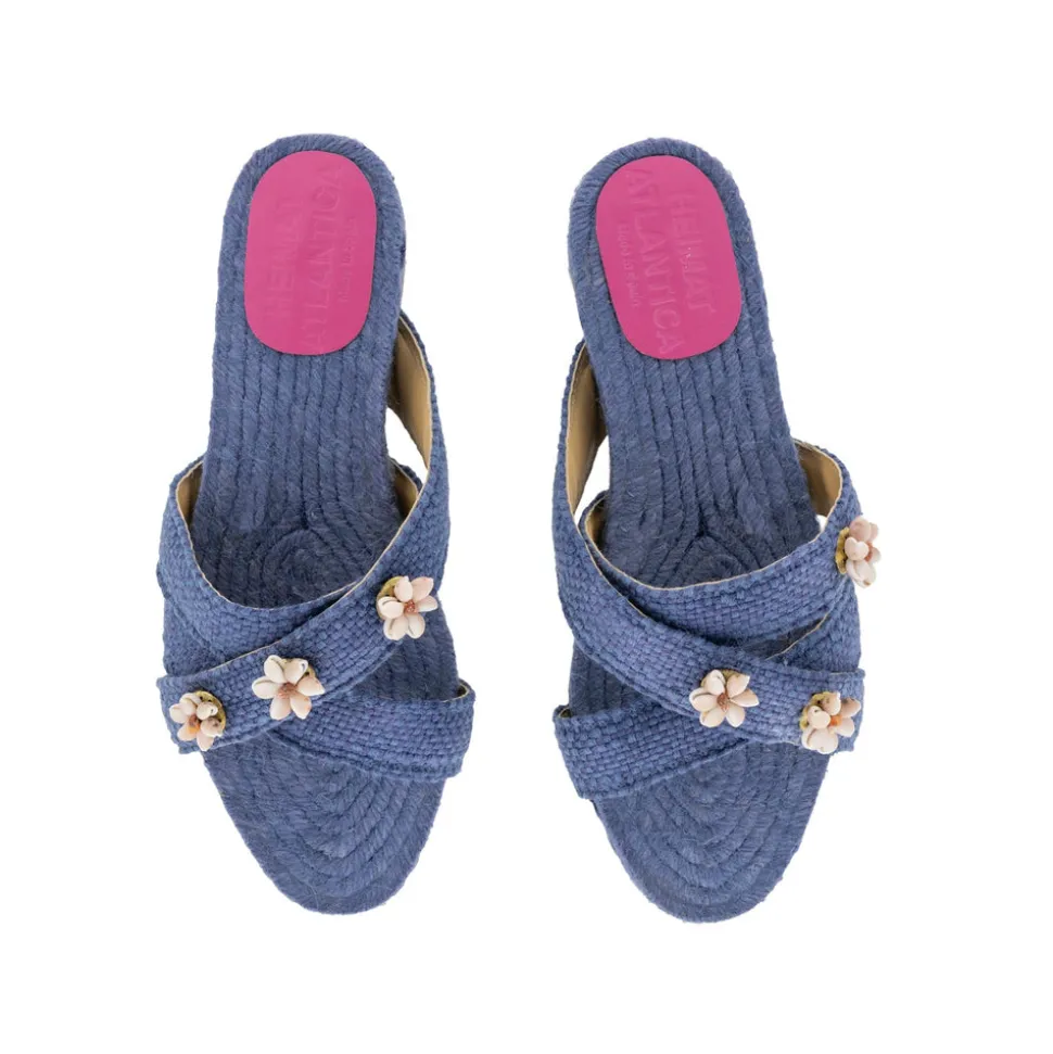 Founder Montserrat Álvarez marries the traditional craftsmanship of coastal Spain and Portugal to a modern sensibility with handwoven reeds, local leatherwork, and porcelain fetiches of the brand’s beach-to-city bags and unique accessories. The Jeans Blue Shella Espadrilles in Dark Blue are a timeless expression of Spanish artistry, crafted in collaboration with the esteemed house of Castañer—renowned for its dedication to handmade footwear since 1927. Meticulously constructed using heritage techniques, these espadrilles are adorned with natural shells hand-embroidered by colareiras, women of Galicia’s Atlantic coast who pass down their intricate craft across generations. In a rich Jean Blue hue, this pair embodies Heimat Atlantica’s distinctive elegance, blending effortless refinement with artisanal legacy.